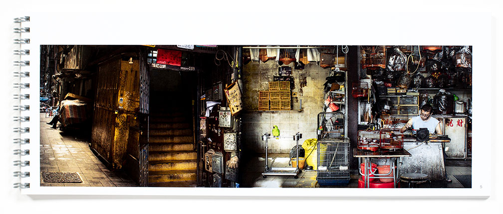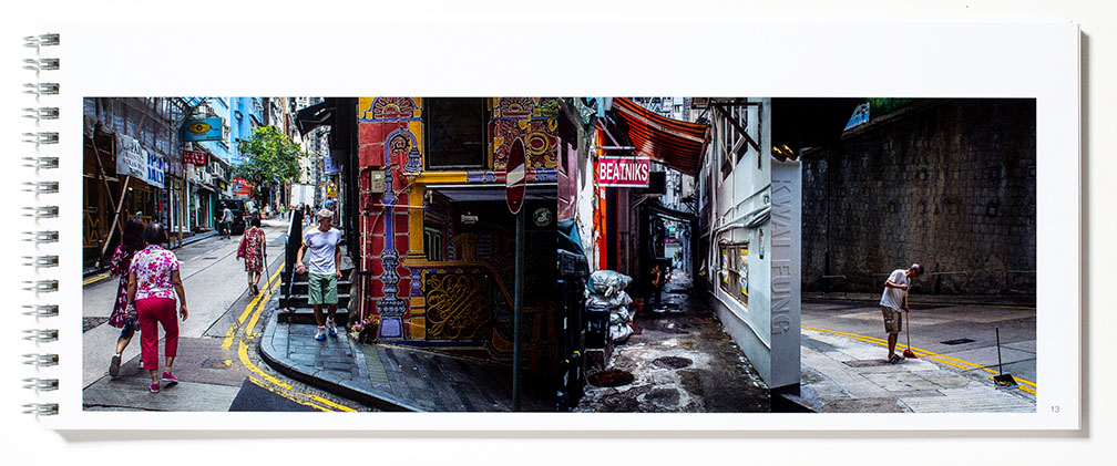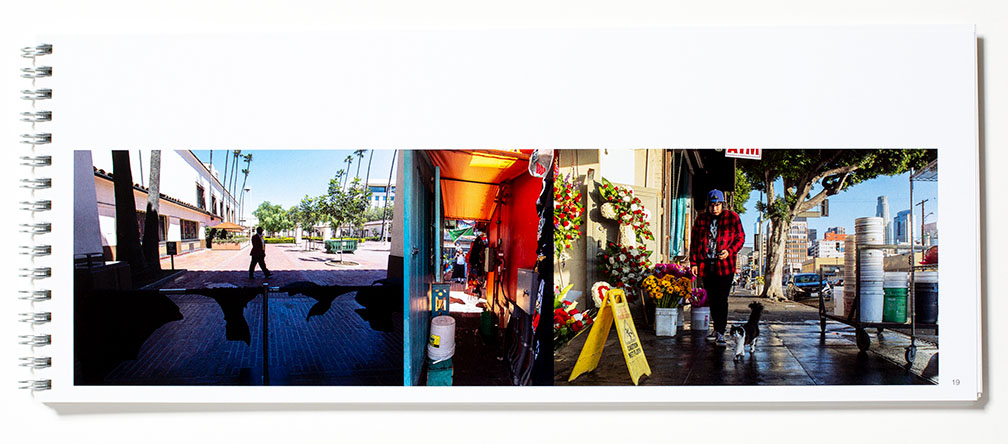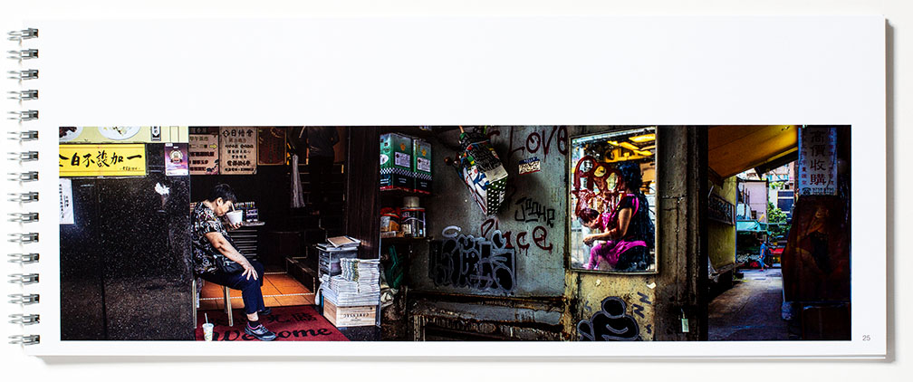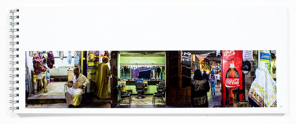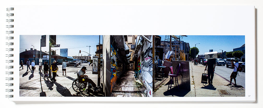 The use of the metal o-wire twin loop binding ensures that the resulting elongated book has an ability to lay absolutely flat. There is one panoramic image per page spread, with a caption on the facing page and each of her wide images has a border of white margin that provides an enjoyable reading experience.
