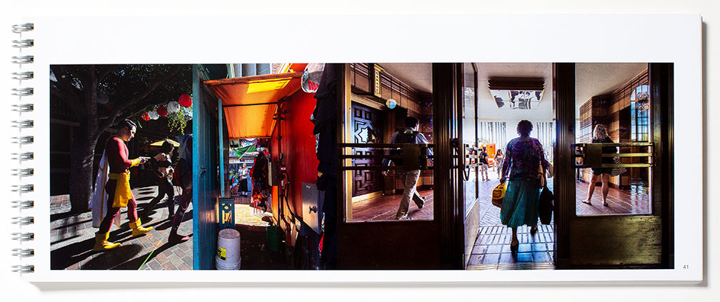 Friedlander’s panoramic images do not appear to have an apparent hard and fast rule in the layout of her multi-image panels. In fact, for many of these juxtapositions, it can be difficult to determine the transitional boundaries of the composited image. It is this visual ambiguity that draws the viewer into her narratives. It is the ability of a keen observer to be able to distill evolving urban events to create a type of poetic theater that captures a sense of urban vibrancy.