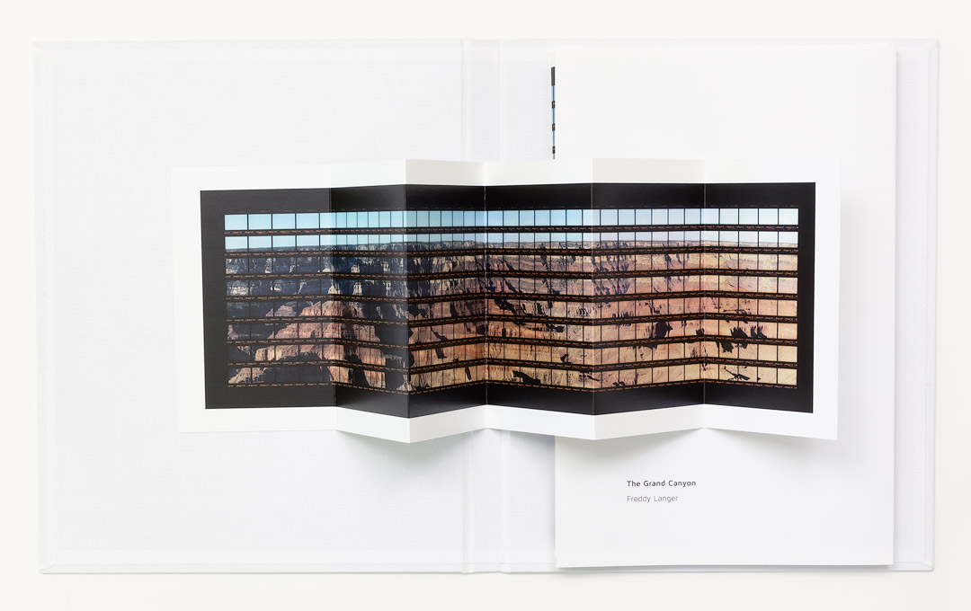This is a hard-bound book with a Leporello binding, and contains two concertina-folded images. The large 150 cm wide Grand Canyon mosaic is attached to the inside rear cover. It has six folds, and includes an essay written by Freddy Langer on its reverse. The essay comments on the history of the Grand Canyon, recalls the ways other artists have depicted the canyon, and discusses the artistic approach taken by Thomas Kellner. A five-fold image is attached to the inside front cover. It is a smaller mosaic called “Grand Canyon 2,” containing 288 individual film frames, and including the photographer’s biography on its reverse side.