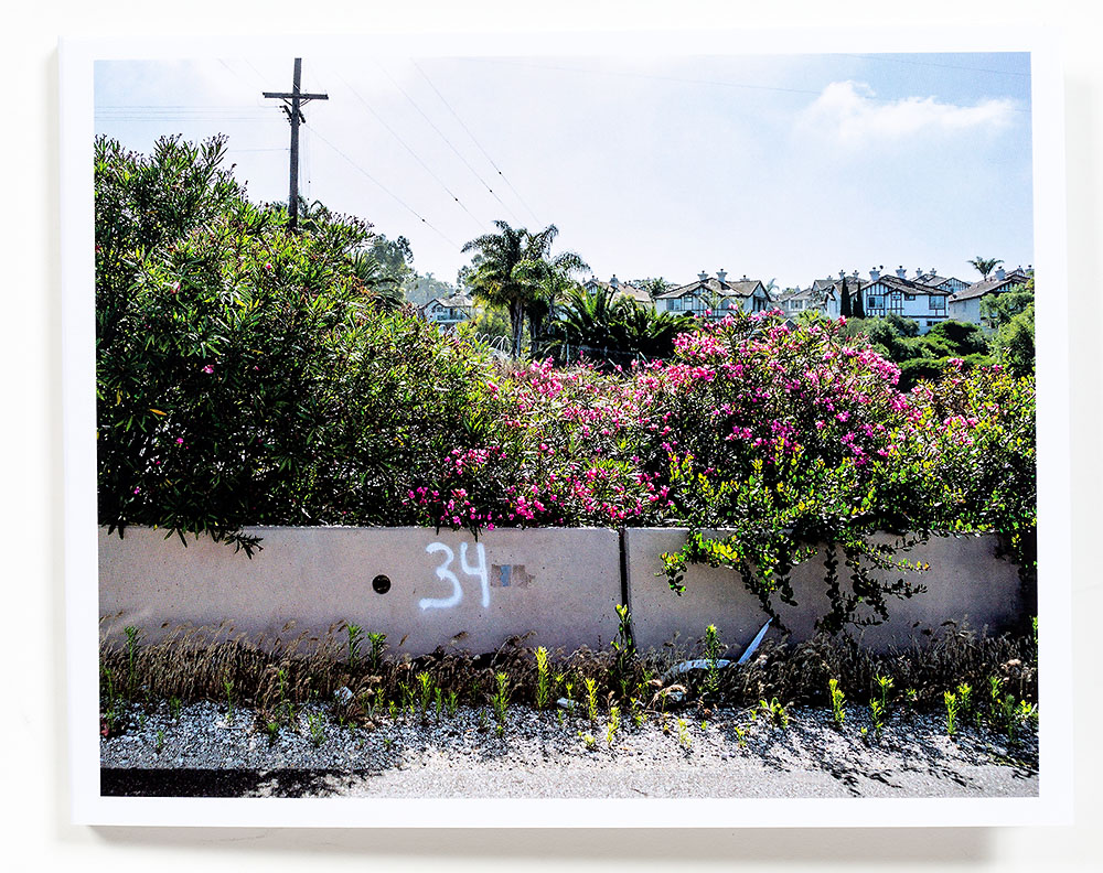 A photobook of innovatively presented and artfully sequenced freeway observations. The 31 photographs that Douglas Stockdale has arranged in leporello (accordion) fashion constitute a panorama of barriers. We sense the static moments of being stuck in stop-and-go traffic, repeated moments sufficient to take photographs of dividers put up for traffic purposes, with ‘beautification’planters placed behind them. There is the aggravation of heavy traffic along the Interstate 5 route toward the border in San Diego; there is the annoyance and challenge of being separated from that which lies beyond the barriers. And we observe details: some houses, some palm trees, the national flag almost beyond reach, and other structures to which we can’t immediately relate. And yet there must be other people there … who and where might they be? And some of the barriers are much less than perfect, they show damage or are surrounded by debris. It is a less than perfect, seemingly endless constructed landscape.
