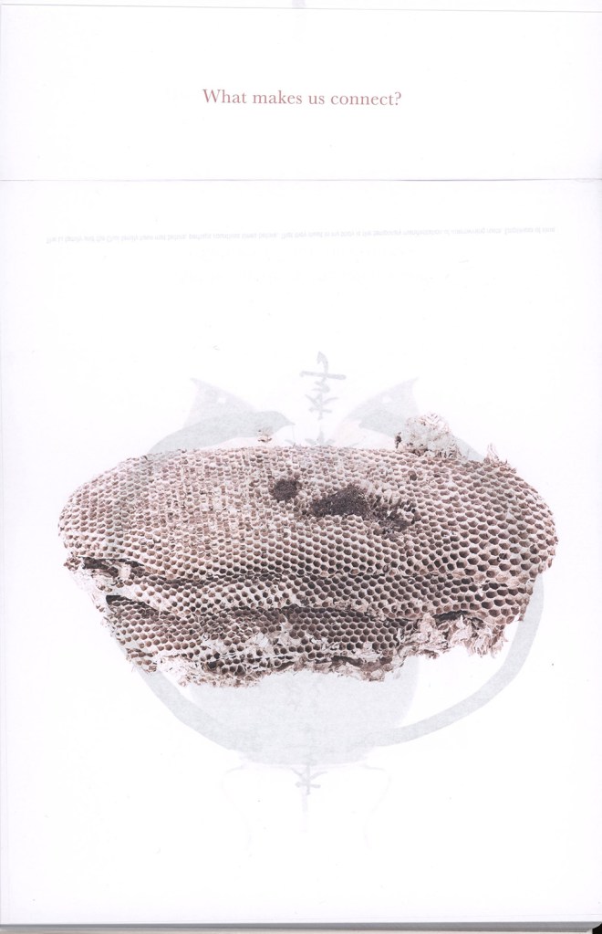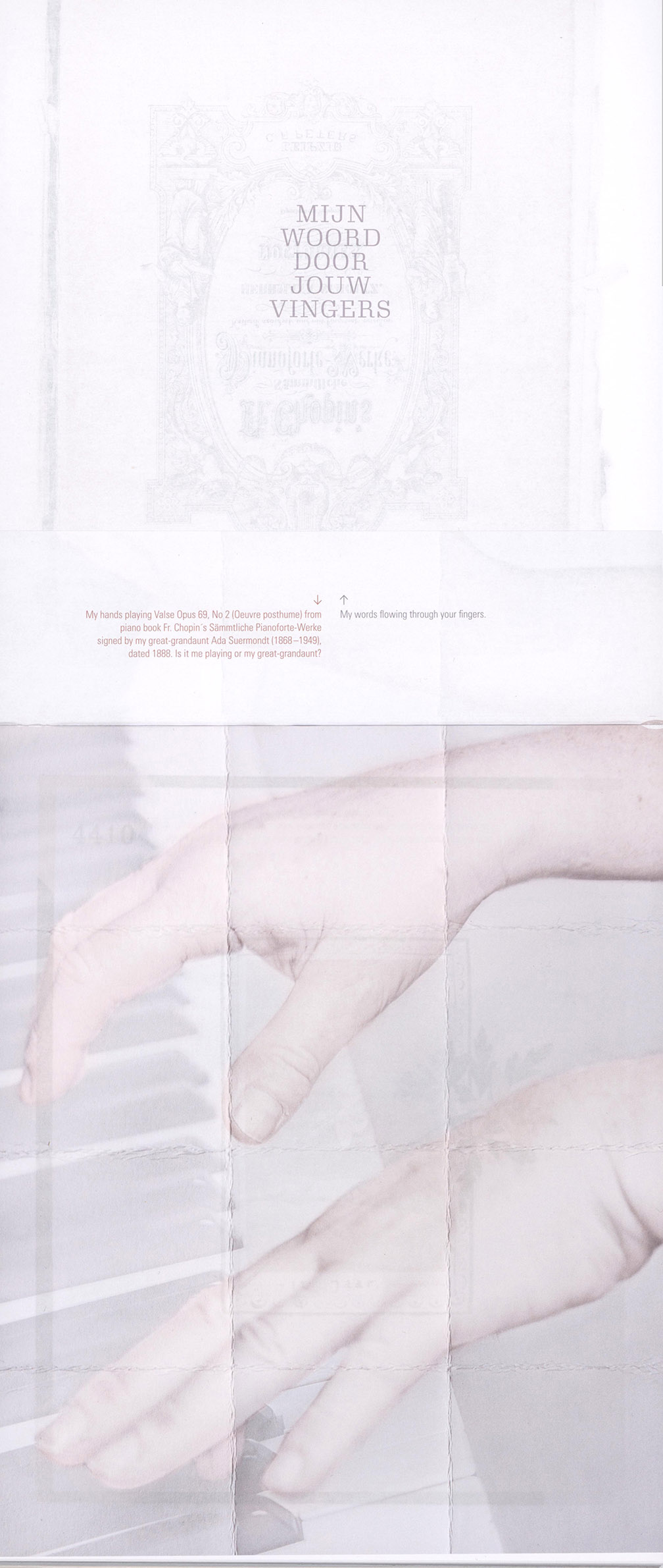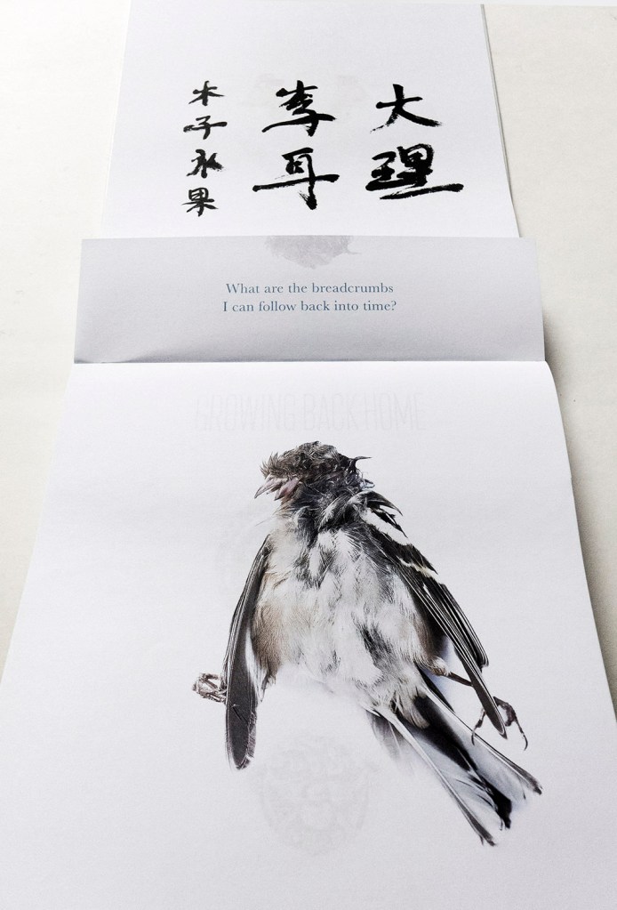 The paper used for the pages is relatively thin, so that the visuals of previous and following pages shine through, especially in strong light, or when the book is held up and turned as the light shines through. This has a mysterious effect that implies interconnectedness and the inevitability of time passing. The large pages are interspersed with mini-pages or flaps that contain little pieces of wisdom or captions and explanations of what is seen above and below. It is difficult to show this effect here, but I have attempted to illustrate it below by presenting the double page with the bird, where the flap also reveals another caption to go with the calligraphy above it. Another example is the double page of the hands playing piano from the notes of an ancestor, with explanations on the flap.