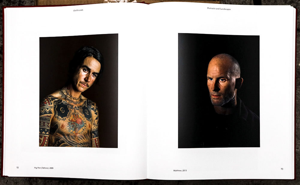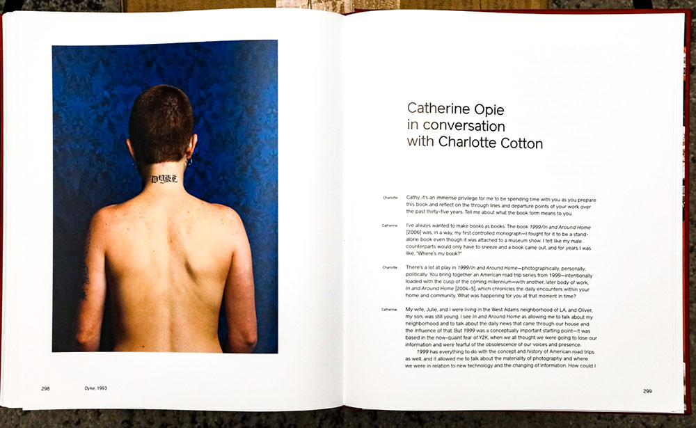 The first image is a small black and white self-portrait from 1970 of a young Catherine Opie. In it, she is posing in the yard of her family home while flexing her muscles. It is an apt introduction that soon evinces her journey to a life engaged with photography. The closing image of People is also a self-portrait from 2009, titled self-portrait/red corner. In between the two self-portraits reveal a diverse methodology. This allows her to tailor an approach to meet the objectives of a given portrait(s), while at the same time, experimenting with the very idea of portraiture.
