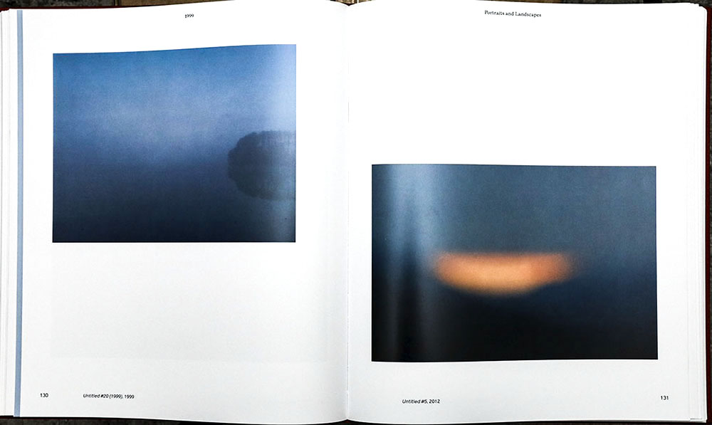 Place finds home to seven images from the Portraits and Landscapes series, all untitled #2,5,9,14,17,15,16 (dates: variable). Mentioned here as they evidence Opie’s malleable approach to the medium. Choosing to produce images out of focus in order to evoke an ethereal sensation of place. Continuing the wide spectrum of photographic possibilities are Somewhere In the Middle (pg. 193,195), which share kinship with color field painting. Freeways, (pg.172-175) on the other hand, are printed as historical documents (irony noted) via the platinum printing process. It’s an instance of her dialogue with the history of photography, specifically with 19th century French photographer Maxime Du Camp and his photographs of the Egyptian pyramids.