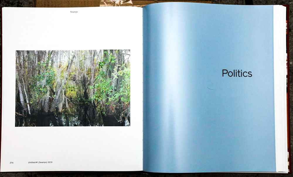 Place takes Opie far and wide, imagining an endless road trip. But it does not ignore her home and local environs – finding ample subject matter to explore and document. Her camera is inclusive, even finding its way to swamps to find beauty in unexpected places. Swamps is at once rhetorical and referential at the same time, as Opie notes in her interview with Ms. Cotton. Positing an agenda of ecological preservation as she cites her photography as bearing witness to the inevitable change that lies ahead. A photo from Swamps (pg. 214, untitled #1, 2019) punctuates the Place to segue towards the final theme: Politics. Here, the phrase, draining the swamp takes on new meaning.