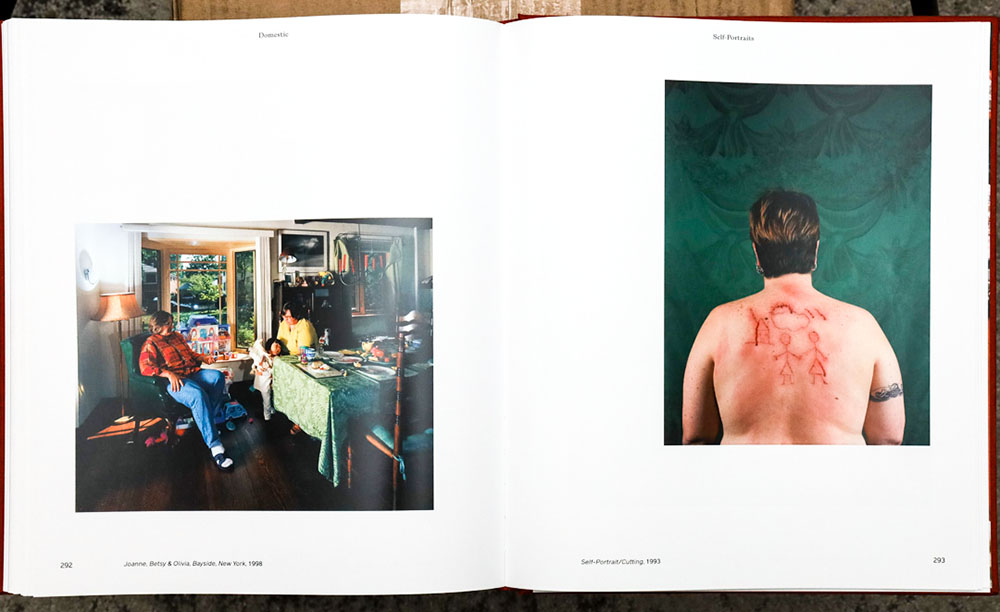 As could be anticipated, Politics makes visible Opie’s affinity for documentary photography. Having cited documentary photographer Lewis Hine as an early influence, she learned, at a young age, of the power to effect change inherent in images. This lends greater efficacy to her practice as a documentarian. Opie continues to emphasize an approach that is first and foremost: varied. No less than sixteen projects are represented among the eighty pages comprising the Politics section. Among these pages one will find two of Opie’s most personal works: Self-Portrait/Pervert, 1994 (pg.258) and Self-Portrait/Cutting,1993 (pg.293). The two photographs are also, arguably the most impactful as well. Opie has spoken at length as to how these two images represented turning points in her life and career.