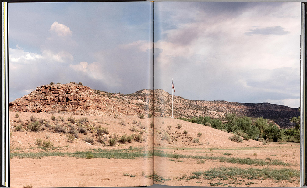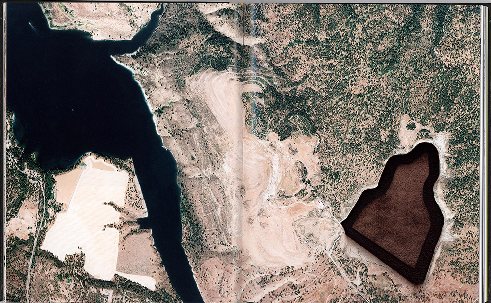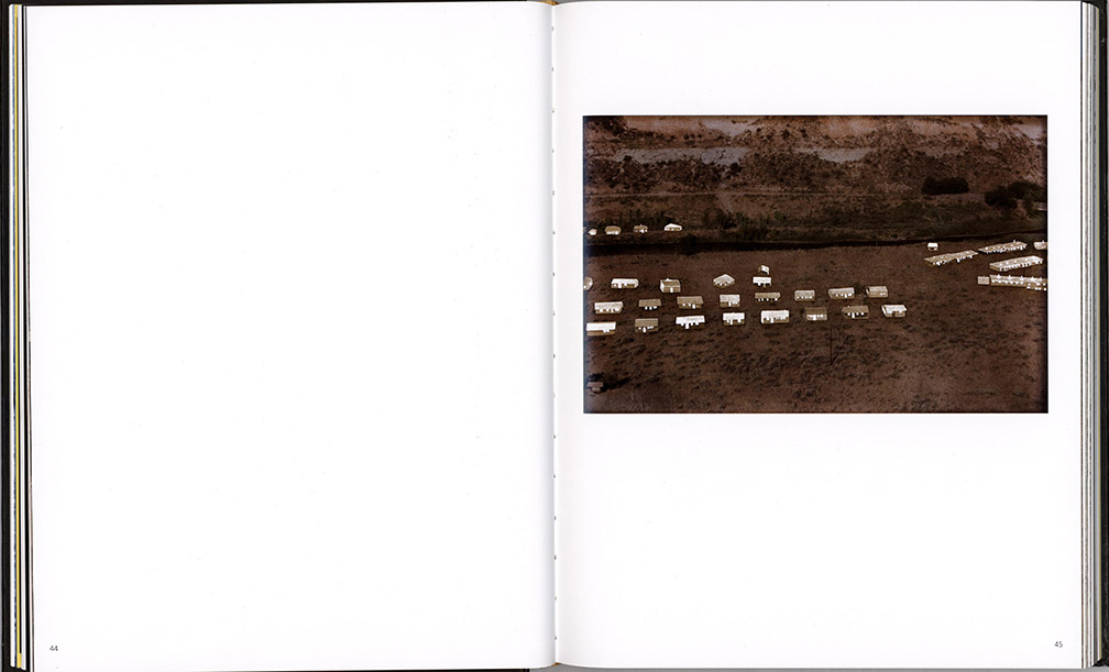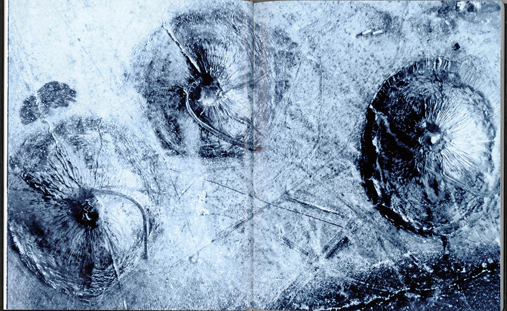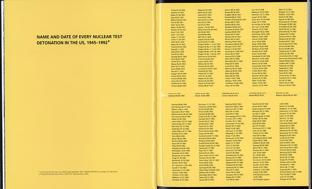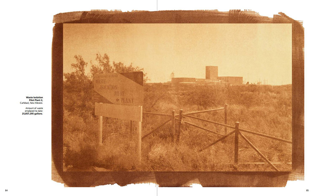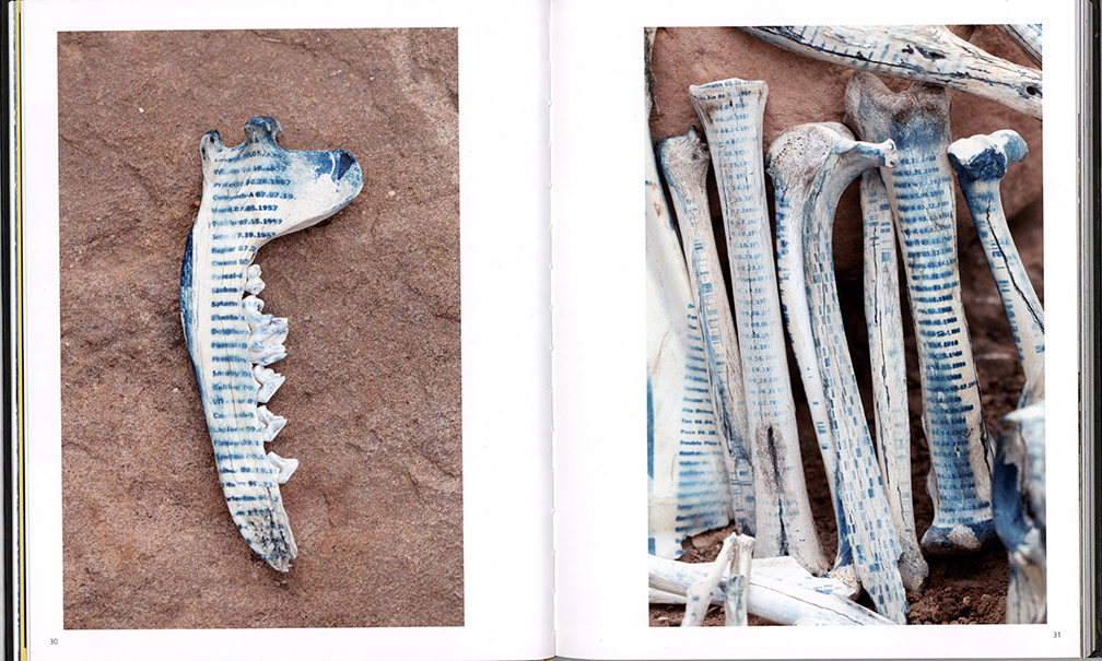 This book is divided into seven parts, each constituting a distinct area of concern. The first two deal with the effects of above-ground nuclear experiments that were permitted until 1963. Two of Hepner’s uncles were young ‘downwind’ casualties of the negative effect of these endeavors. We see aerial shots of nuclear experiment craters in Nevada and a gatefold list of every one of the 1040 nuclear bomb detonations in the US. We get an eerie feeling that these images are like those of cancerous growths. A second series presents images of animal bones from the southwestern US which the artist imprinted (by cyanotype process) with DNA information as well as with the dates of every one of these thousand+ explosions.