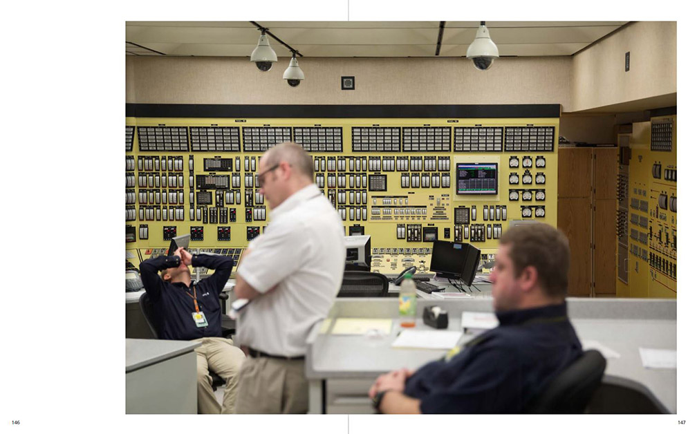 Storage locations of radioactive waste are seen as almost invisible scars and slight elevations marring the landscape, as are experimental and former labs and current nuclear plants that are oddly out of step with the scenes of nature that surround them. The composite reconstructions of the town of Uravan, Colorado, no longer in existence due to nuclear contamination, are fascinating. Particularly effective is Hepner’s technique of using uranium to create the prints showing some of the other sites: we see an older technique of a photographic process applied to show a seemingly fading presence of some nuclear stuff that will not go away and may haunt us for hundreds of years or longer. The subject is objectified and, in the process of depiction, is also forced to undergo a treatment with its own ingredient used in creating the prints. Furthermore, the use of uranium instead of silver in printing the images gives them the same macabre yellow-orangy color that the sky had after the Hiroshima detonation. The book concludes with inside views of a nuclear ‘Control Room,’ as well as a very cogent and insightful essay by Kirsten Pai Buick.