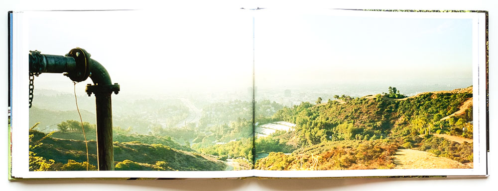 Along the road we see shots of lush green mountain vistas taken during the rainy season, as well as the browned-out hills of summer and fall. We also see the inevitable incursions of urban life: high-tension lines, non-native landscaping, chain-link fences, blank walls, standpipes, dumpsters, tract homes, and mansions. Many images have a washed-out look that accurately captures LA’s typical hazy summer sunshine. And the long-exposure blur of automobiles rushing by reminds us of the road’s purpose.