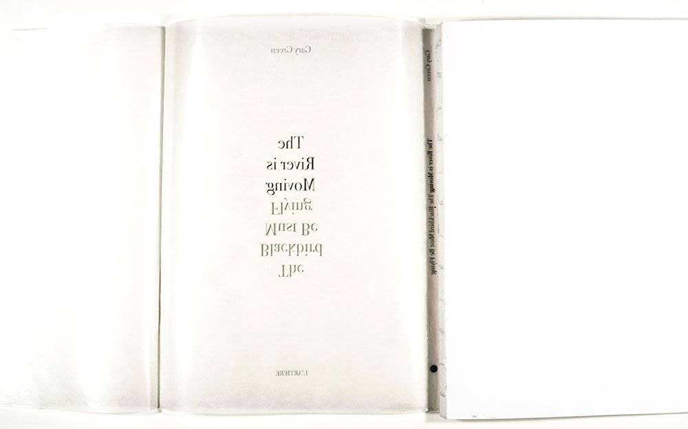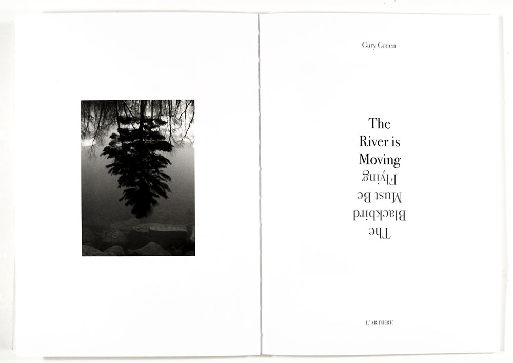 Gary Green’s monograph The River is Moving/The Blackbird Must be Flying (L’Artiere, 2020) is a beautiful and delicate object. Measuring 6 ½” by 9 ½”, enclosed between plain white softcovers, the book features a perfect binding with visible spine. In this exposed Smythe style of binding, the spine remains uncovered, leaving open the folded signatures, glue and thread. The front coverboard is blank. Wrapping around the book is a translucent vellum dust jacket with author, title and publisher printed on the front. The back of the dust jacket has no printing, allowing the viewer to see through the vellum, hazily, an image of a single pine tree printed on the rear book cover. Or, more accurately, it is a photograph of a reflection of a tree, an upside-down image hovering stilly on a surface of water.
