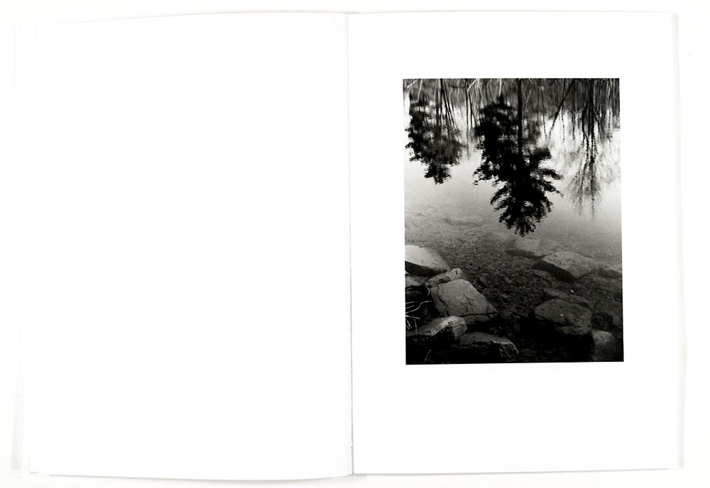 And this leads to my second reason for writing in such sharp detail about this book. The photograph printed on the back cover is also printed inside the book, facing the title page, making it, thus the book’s first and last image. Appropriate, in that of the 24 photographs, fully 14 seem to be of the reflection of this same pine tree. Green has presented us, with (what seems to be) truly a meditation on a single point of nature in various incarnations and manifestations, a singular object reflected (refracted and shadowed) in stillness, movement, various blurs and ripples, states of clarity and obscurity.