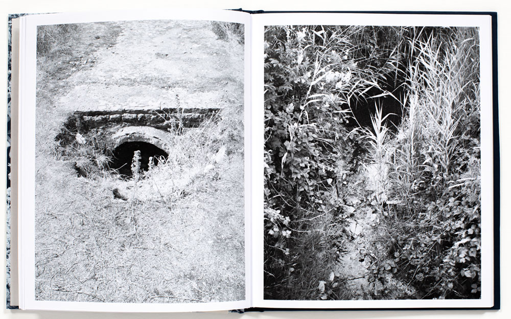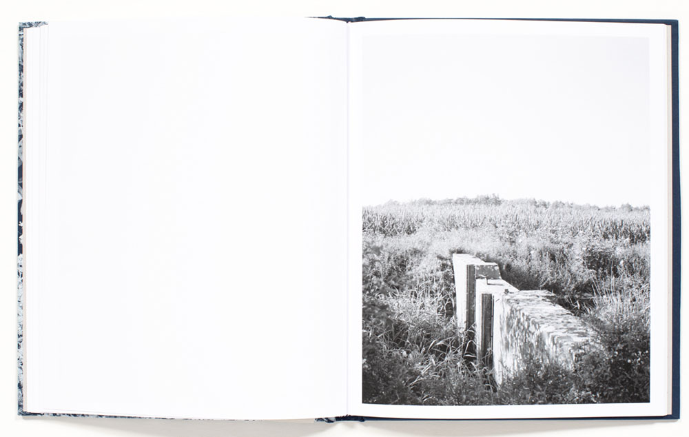 What appears evident in this project is how nature is slowly reclaiming man’s intrusion. The ditches of the 1940’s due to soil erosion now appear as meandering creeks, dry-bed washes or slightly swampy area that have become overgrown with weeds and other vegetation. The concrete man-built structures are slowly crumbling into versions of abstract sculpture, perhaps more of an inconvenience or visual nuisance to farmers and others. Comparably speaking to other Aftermath projects this man-built WWII construction has created relatively benign environmental impact. Thus, an island landscape without any drama. Even the books title, The Ditch, appears benign, while the embossed title on the cover is hardly evident, almost invisible, blending into the cover’s vegetation similar to this WWII edifice.