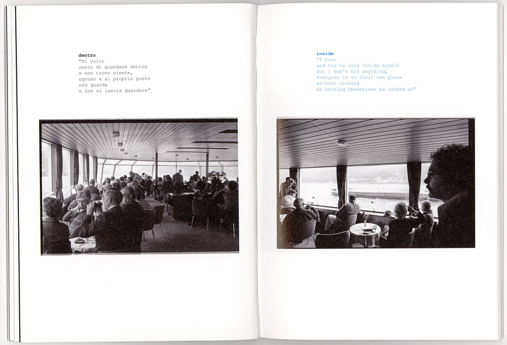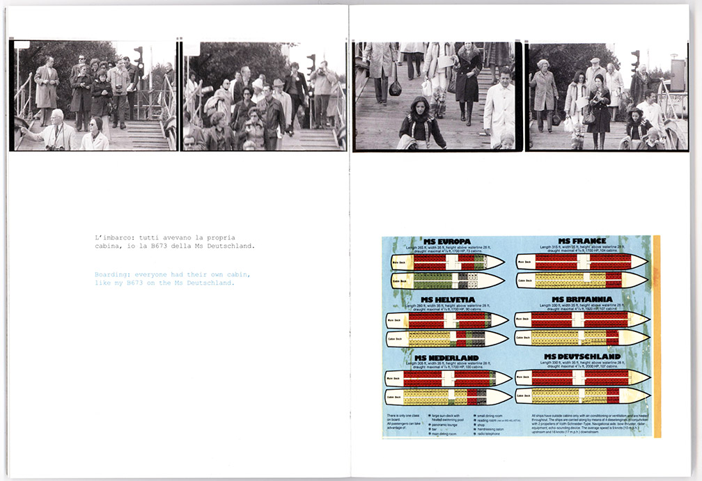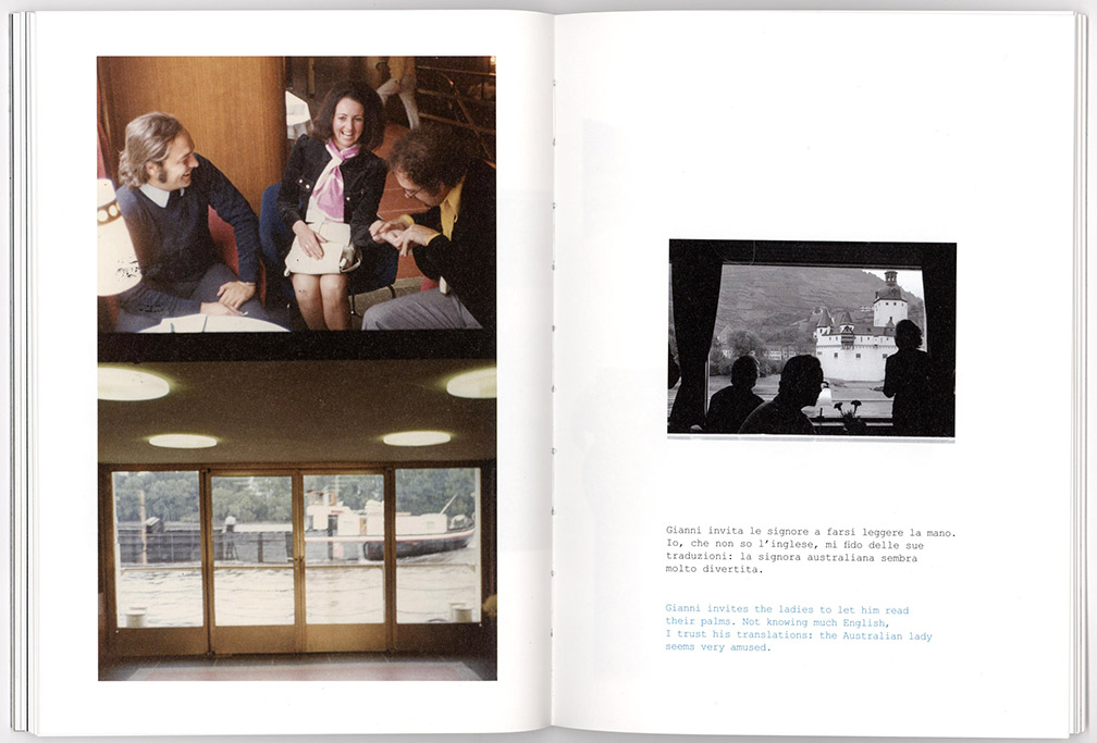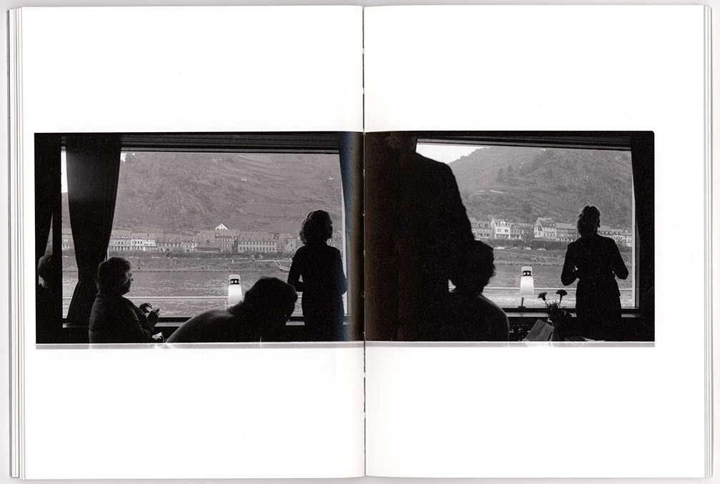 La Pietra’s project is different. As a photographer who is also a designer and a filmmaker, he has an excellent sense of visual variation and cinematic sequencing for storytelling purposes. Thus the photographs are supplemented by drawings and observations in the form of texts as we progress through the journey along with him and his friends. We participate in the experience, and the shoreline sights can be observed from the perspective of being on the boat along with them. The emphasis is always on interaction or lack of it, on communication and discovery. It is almost like an experiment in time travel and transverse culture, to see a river cruise in Germany through the eyes of young Italians, now, some 40 years later.