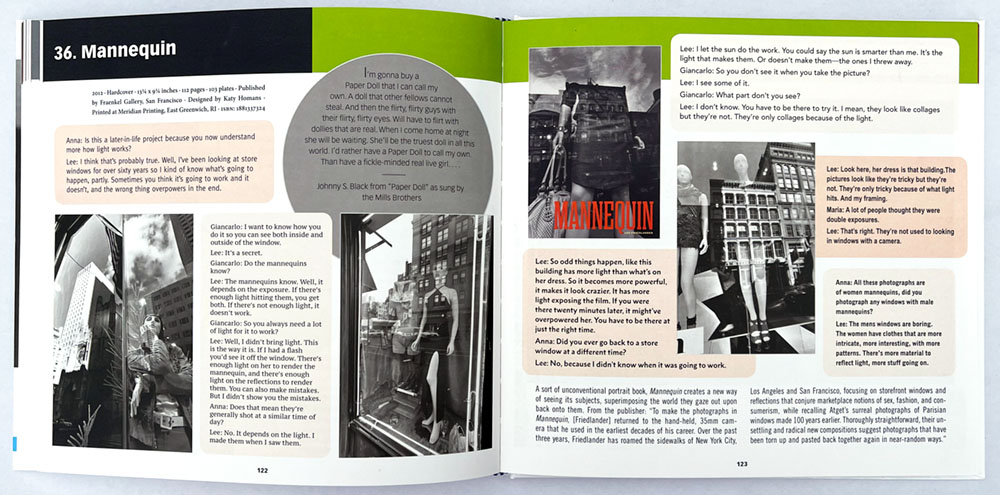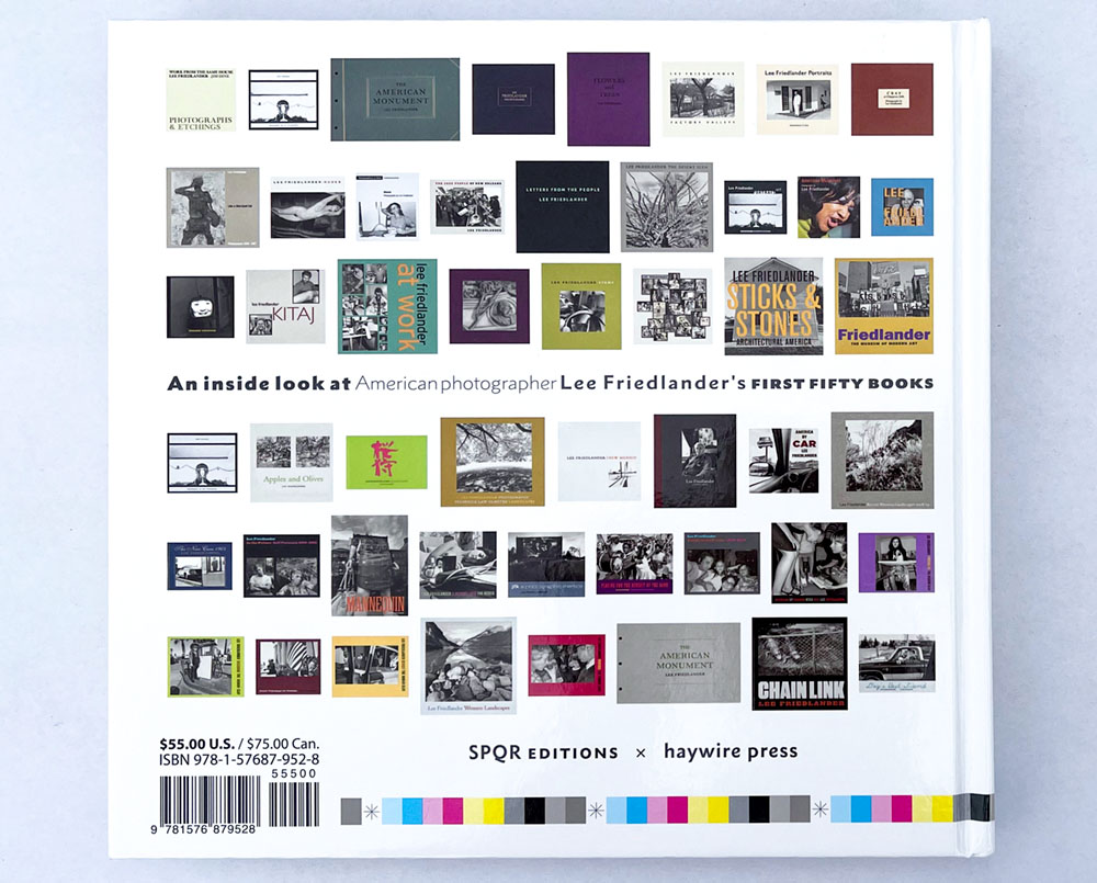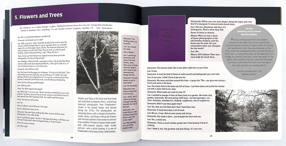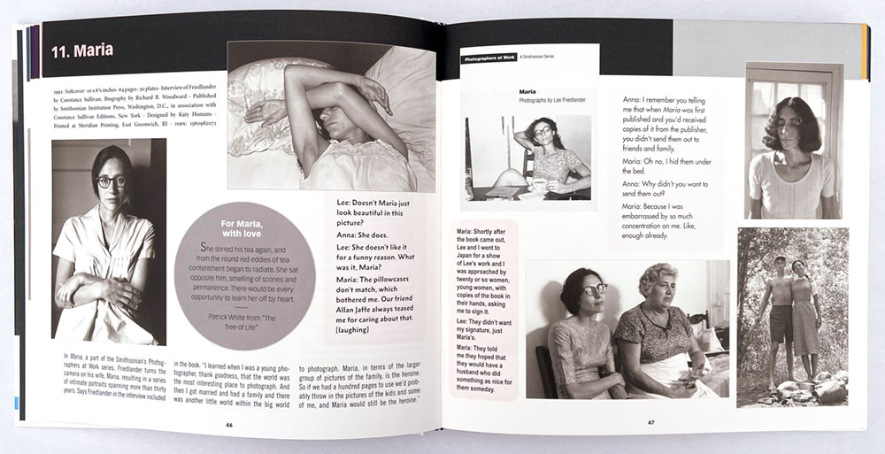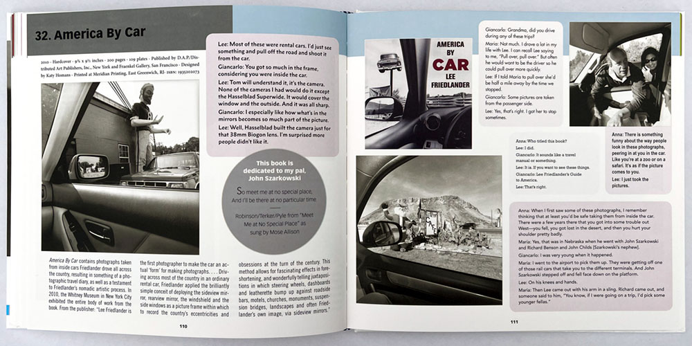 Including the conversations in the book wasn’t part of Giancarlo Roma’s original plan for Friedlander First Fifty. The book was initially envisioned as a guide to the big twenty-thousand dollar boxed set which includes one copy of each of the books, something to help the owner feel a little less lost, a kind of card catalog to the Friedlander library. Boring, to be frank. But the snippets of conversation, some just a few lines while others run to a half page of small print, transform the book and, for me, offer insight into Lee’s work that so many other essays and introductions failed to provide.