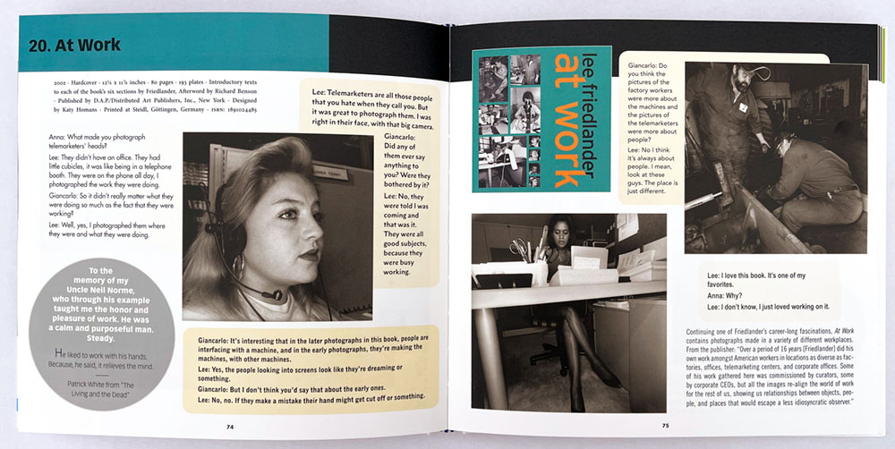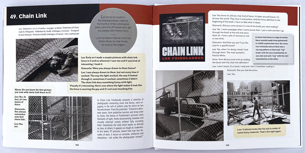 Including the conversations in the book wasn’t part of Giancarlo Roma’s original plan for Friedlander First Fifty. The book was initially envisioned as a guide to the big twenty-thousand dollar boxed set which includes one copy of each of the books, something to help the owner feel a little less lost, a kind of card catalog to the Friedlander library. Boring, to be frank. But the snippets of conversation, some just a few lines while others run to a half page of small print, transform the book and, for me, offer insight into Lee’s work that so many other essays and introductions failed to provide.