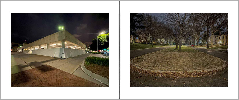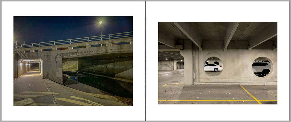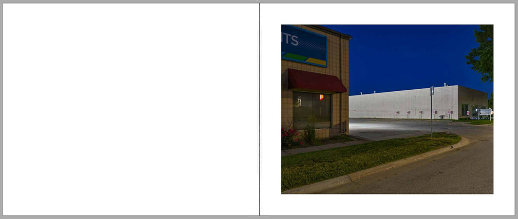 Bruhn’s photobook is beautiful; it has a handsome linen-like cover, with a tipped-in photo; it is beautifully printed on beautifully large pages; the images are beautifully composed as well. As the line in the musical Cabaret goes, “HERE, life is beautiful …” And yet, beauty can be deceiving. We see mostly nightscapes of neighborhoods, freeways, industrial areas, garages, and more. A few cars are scattered about here and there in the urban and rural landscapes, almost lost. And people are nowhere to be found, and yet some lights are on here and there. What might be going on behind those walls, if anything? The atmosphere is eerie, to say the least, like in a twilight zone. The sequencing of the images is well thought out, in that some blank pages allow us to rest and contemplate the image on the opposite right-hand page. Will something be going on there tomorrow? There is also no explanatory text of any sort from the author in the entire book.