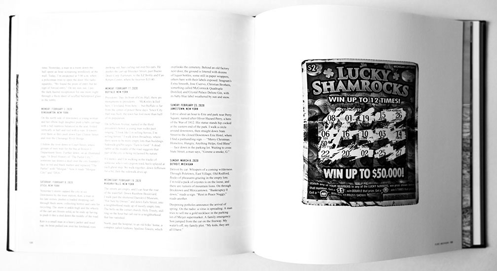 Black kept notes throughout his travels and their inclusion is a welcome addition in this book. The reader is thus able to feel as if they too are road-weary, hungry, and tired. We experience the intimate details that some viewers may find lacking in Black’s images. Another advantage of viewing this body of work in book form are the photographic illustrations of discarded items such as cigarette packs and a multitude of handwritten signs displaying varied yet consistent ways of trying to make it through another day.