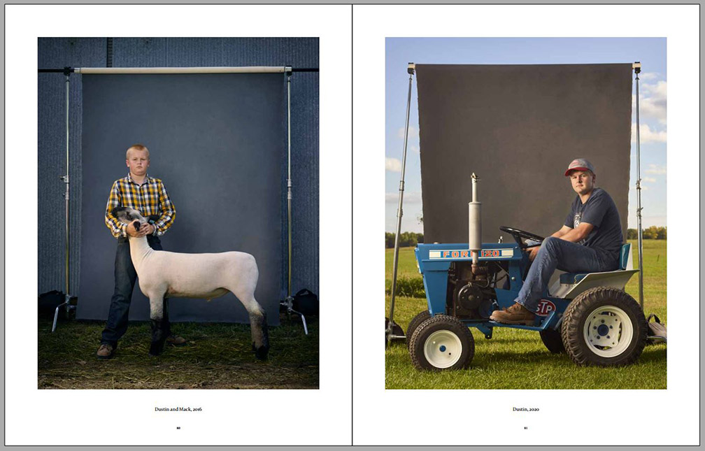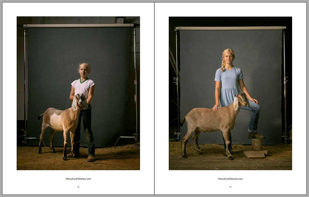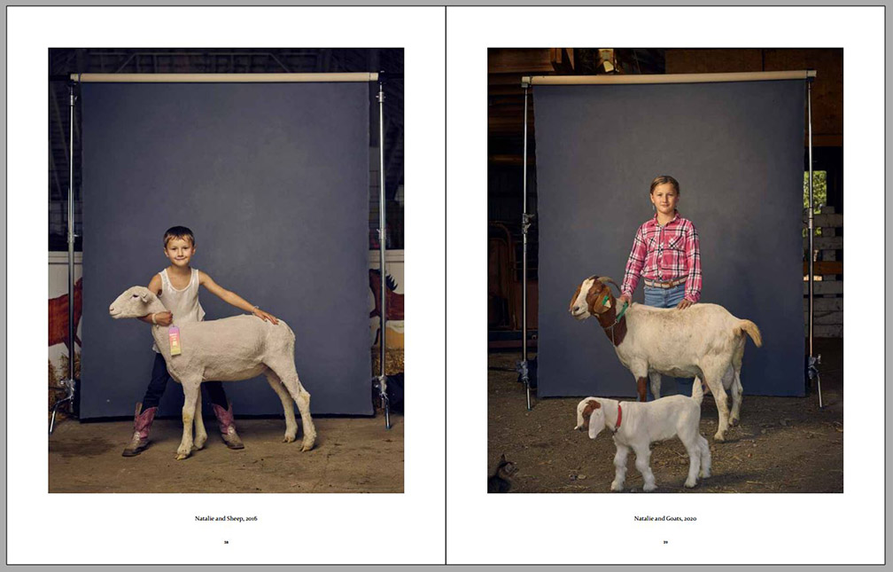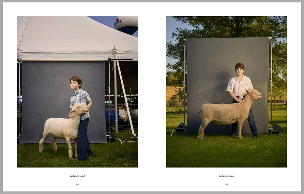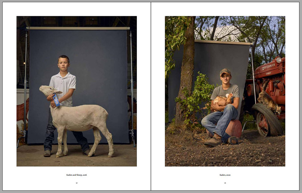 Four years later the photographer visited the same kids again and had them participate in similar environmental portraits, with animal companions or other elements important to their lives at that time (always on the right-hand side on the sample pages below). We can observe certain amounts of growth, both physical and social, since their contexts have expanded, while their commitment to small-family-farm life in the American Midwest can still be observed. Animals are still important to them, but so are other activities. This second series of environmental portraits is marked by expanded horizons – we can see more of what is around each of them as well as what other interests some of them have developed.
