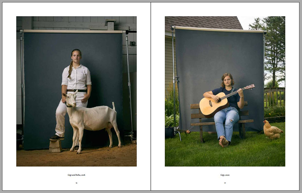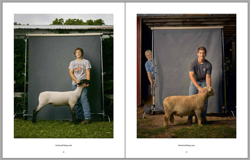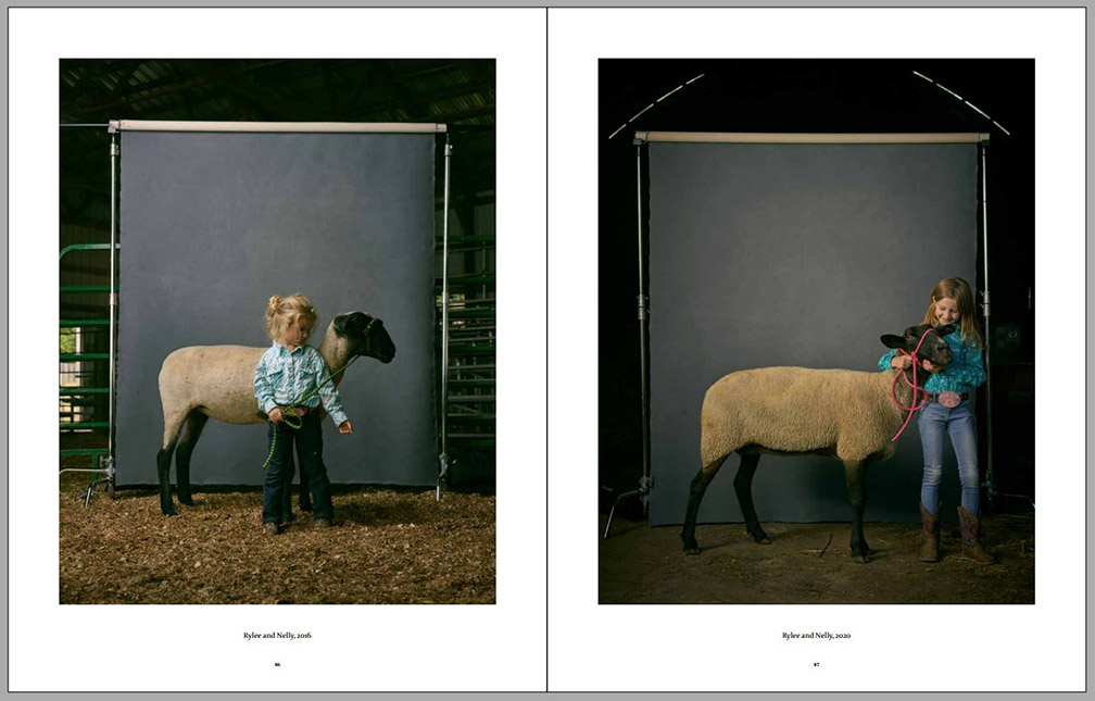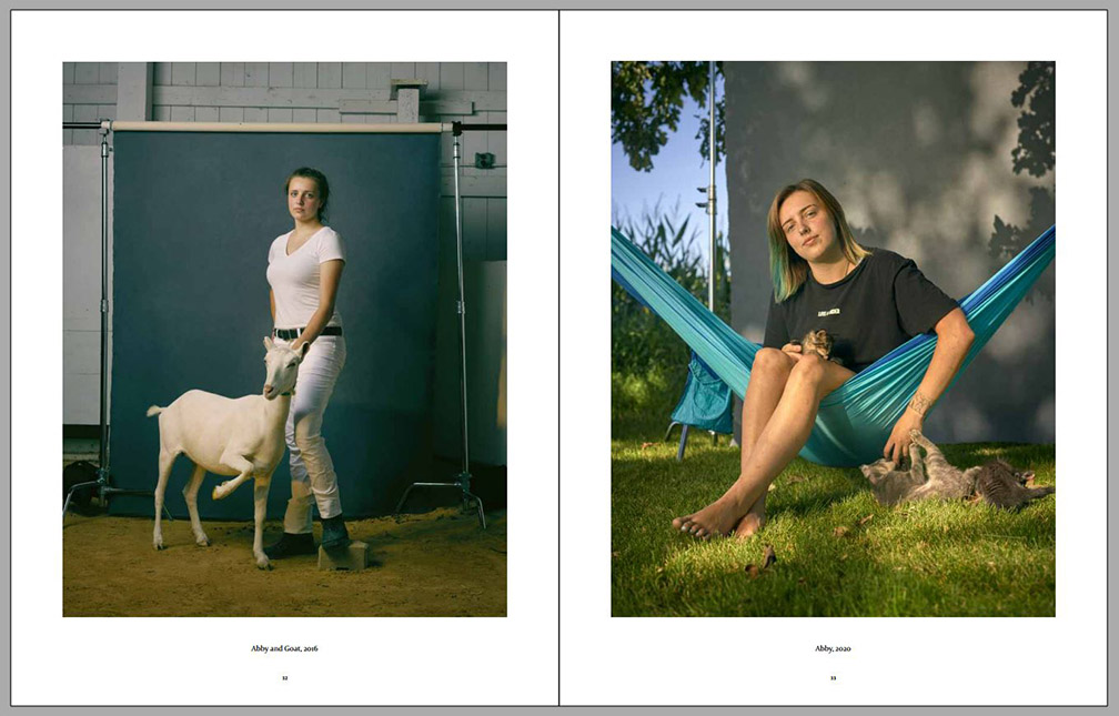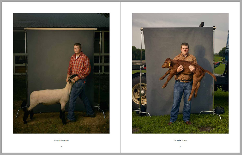 Four years later the photographer visited the same kids again and had them participate in similar environmental portraits, with animal companions or other elements important to their lives at that time (always on the right-hand side on the sample pages below). We can observe certain amounts of growth, both physical and social, since their contexts have expanded, while their commitment to small-family-farm life in the American Midwest can still be observed. Animals are still important to them, but so are other activities. This second series of environmental portraits is marked by expanded horizons – we can see more of what is around each of them as well as what other interests some of them have developed.