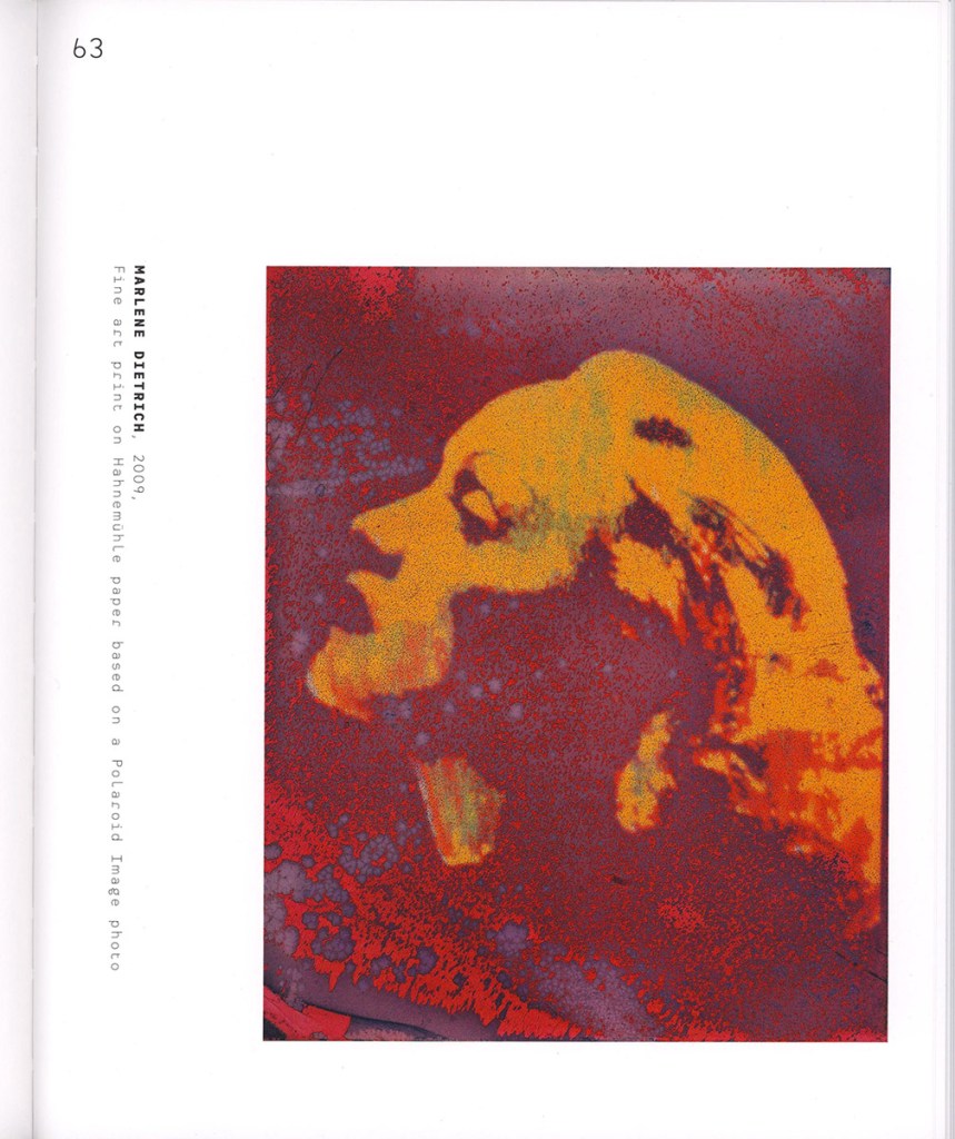 The portraits are very specifically produced, using abstraction and color while maintaining major impact and recognizability. The legendary singer and performer Marlene Dietrich is depicted in a semi-abstract image, diffused with vibrant warm colors, in such a way as to transmit a certain kind of eroticism and mystique, while maintaining a substantial distance to the subject (shown below). Other portraits, such as Picasso and Hockney, are more muted in effect, while others, such as Max Ernst and Francis Bacon, are marked by over-the-top or increased saturation. Each portrait shows the artist’s interpretation of well-known figures, which the viewer can check against their own recollections and concepts.