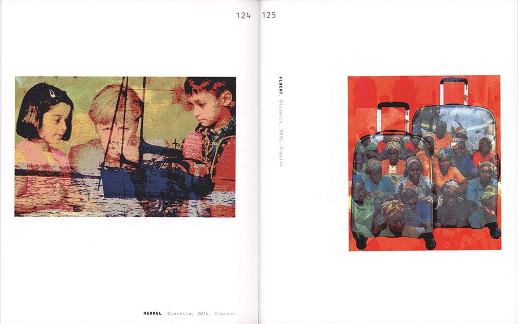 The political images are also most interesting. Examples shown below include Döring-Spengler’s approach to over-simplified populism in the United States, the previous German chancellor’s approach to the refugee problem, and the deaths suffered at the hands of the former East German state. In all cases, the combined image portions and the color schemes and compositional acumen make for very strong statements, eliciting responses from the viewers.