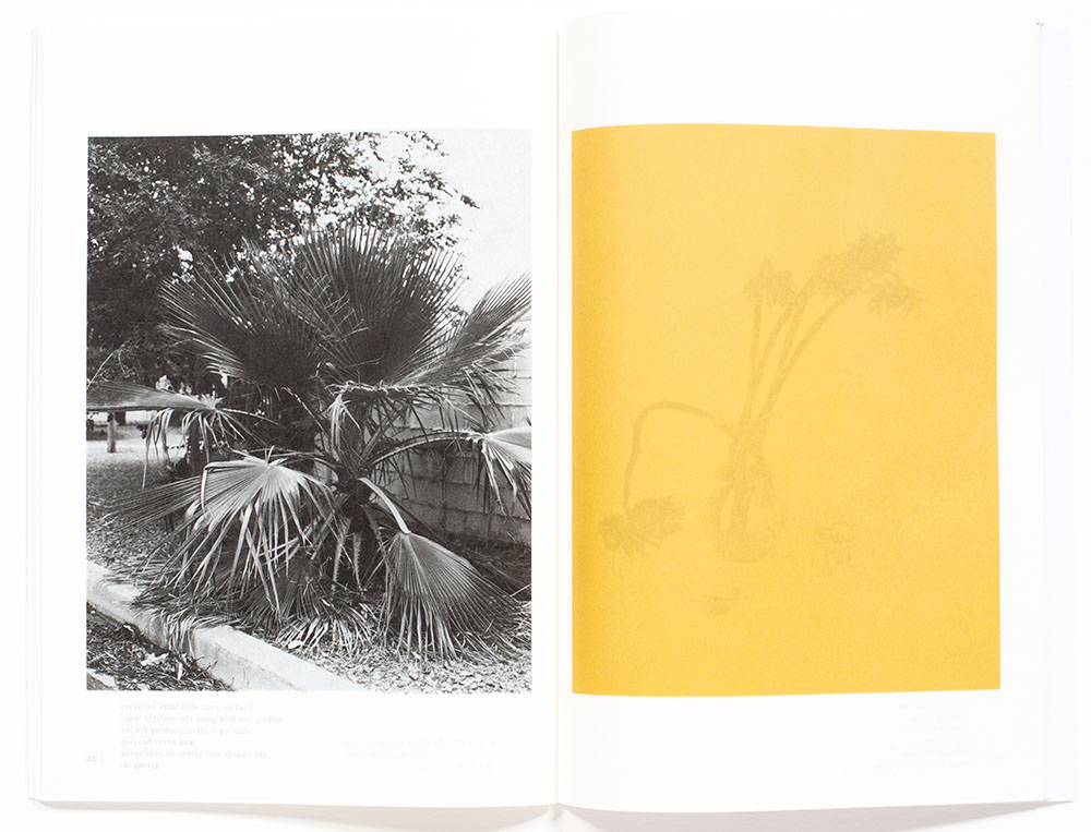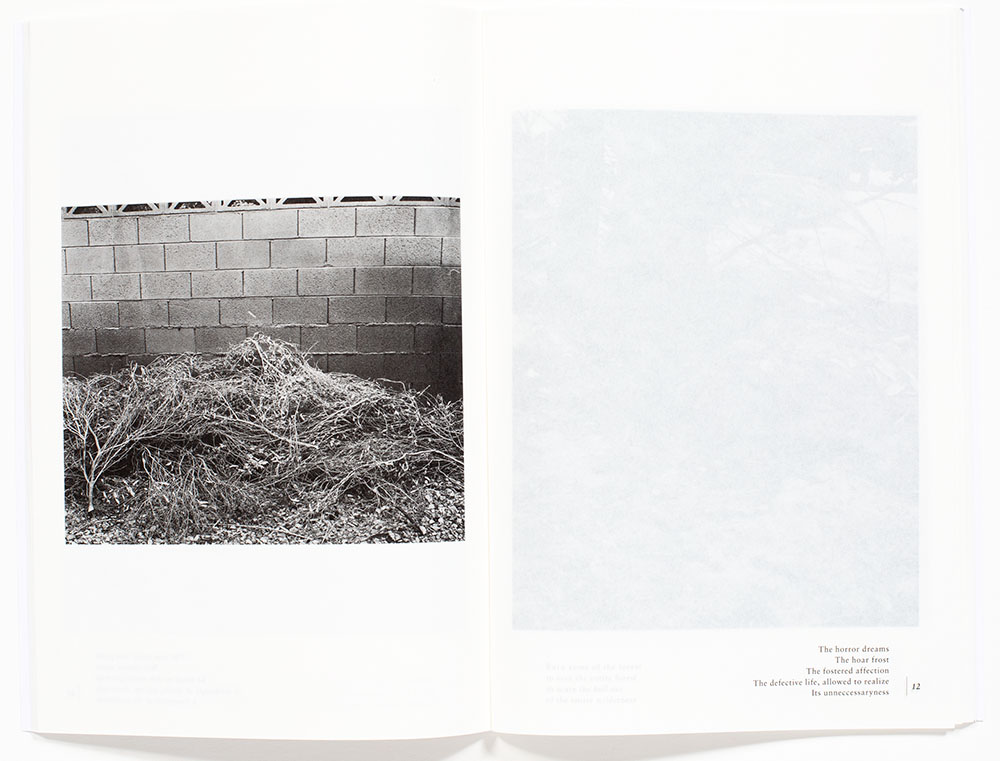 His photographs are a combination of botanical still lifes and urban landscapes. The still life images seem emotional detached, with the botanical objects coolly floating on the page isolated from any environmental context. These studies provide an opportunity for a focused gaze. His botanical subjects have all seen better days as even the pots are either worn or altogether missing. The still life images are juxtaposed with found plants, bushes, parts of trees and other urban vegetation, similarly in a state of decline or showing a lack of care and maintenance.