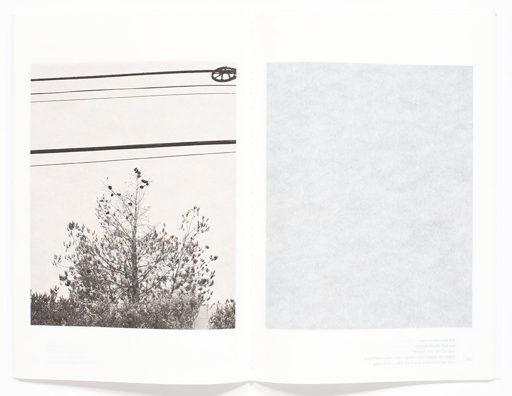 The translucent paper correspondingly reduces the contrast of the photographic images that are lacking a bright white and the darker values, such as the second page spread below, appear ‘muddy’. This visual effect may also be due in part to the color field printed on the opposite page. Depending on the choice of color backing the photograph there are some combinations that provide a very gloomy appearance and feeling.
