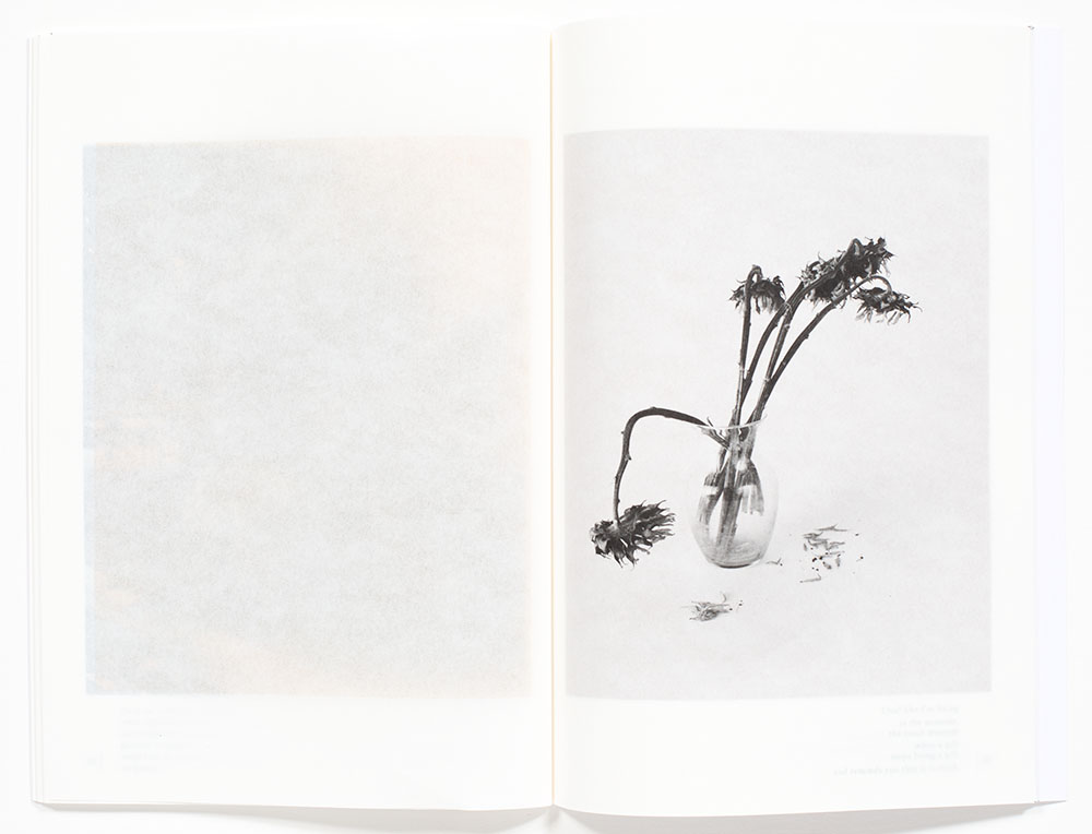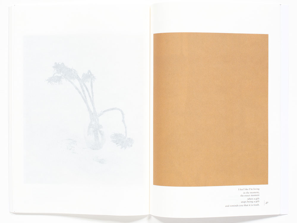 Another combination is a color block printed on one page that is positioned over a black and white photograph printed on the subsequent page, that in turn is juxtaposed over another color block printed on the next page, illustrated on the last three-page spreads below. In this last series below, the botanical still life initially has warmth that progresses to a duller and more somber brown tones, symbolically implying what occurs to cut flowers over time without water. A very delightful sequencing of photographs and color.