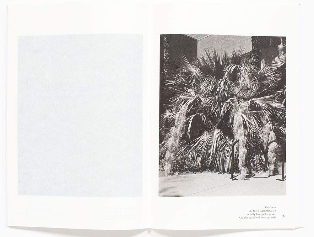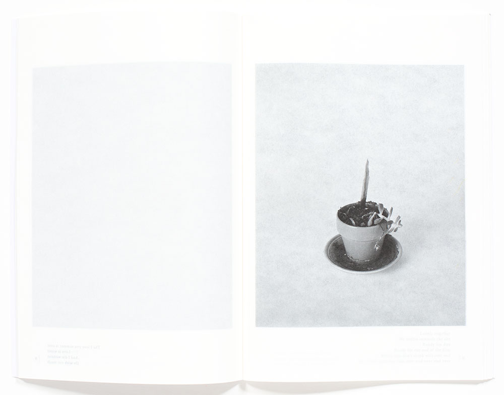 The printed poetic text on the bottom margin of the page also provides multiple readings, as the text can be read through multiple pages, which is only hinted at in the first page spread below. This page design raises an intriguing question; is the text of the poem applicable to the specific page it is printed on or all of the pages that it is readable? Further complicated when a poem is the only printed item, yet due to the translucent nature of the paper, the ghostly photo on the beneath page is barely discernable. These combinations create a complex and layered reading.