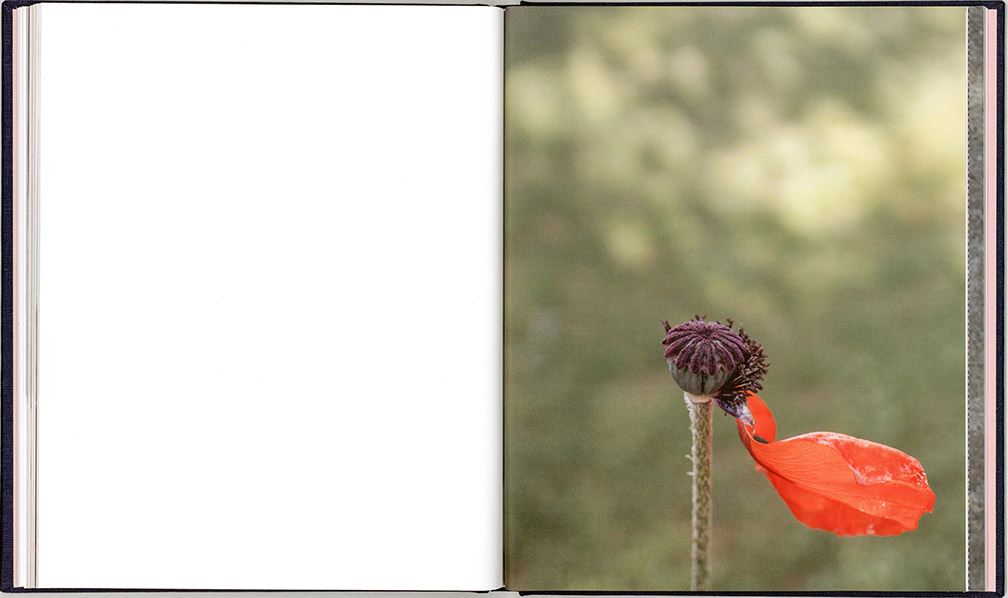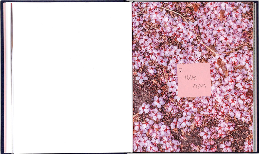 The design contains a number of innovations: an actual sticky note is attached to the page with a vast array of flowers, as you can see below. An actual snapshot is inserted toward the end of the book as a memento for all of us. The poetic language of Julia Vandenoever gives us a glimpse of her innermost struggles. Her explanations in the artist statement provide valuable detail about the genesis and progress of the project.
