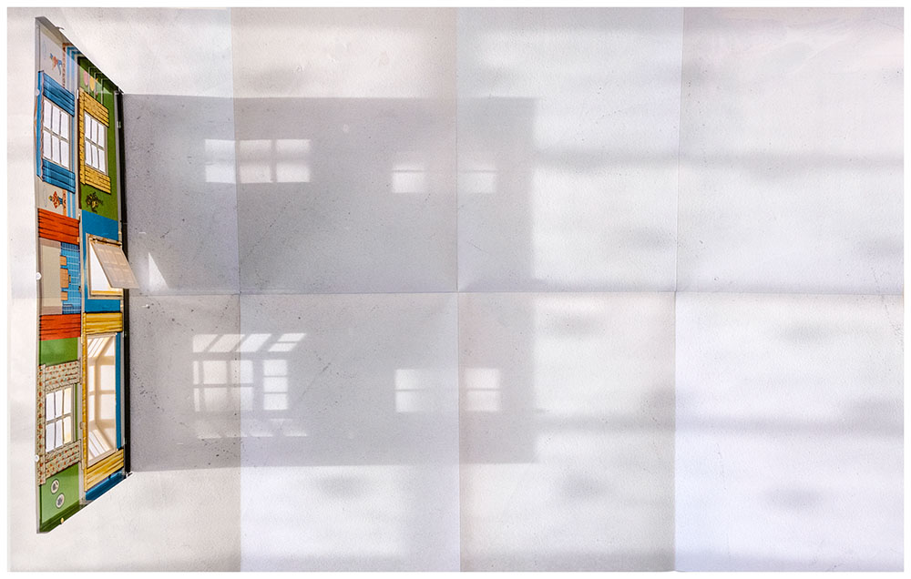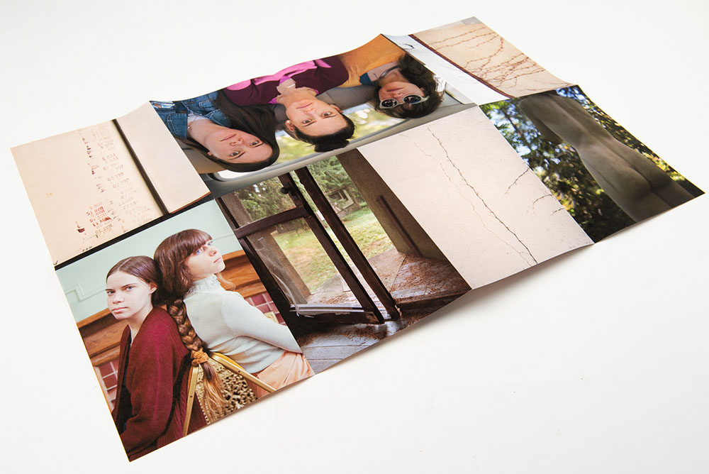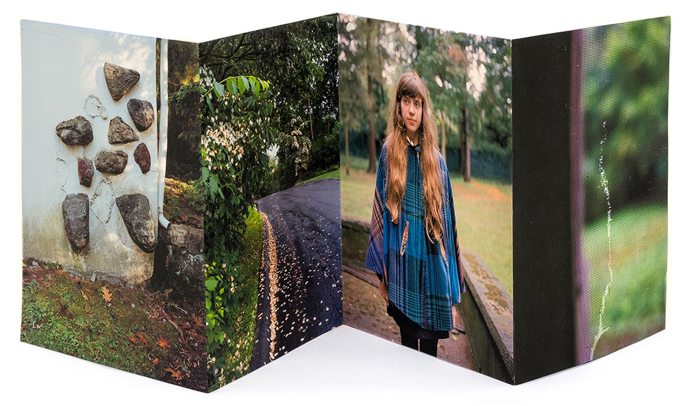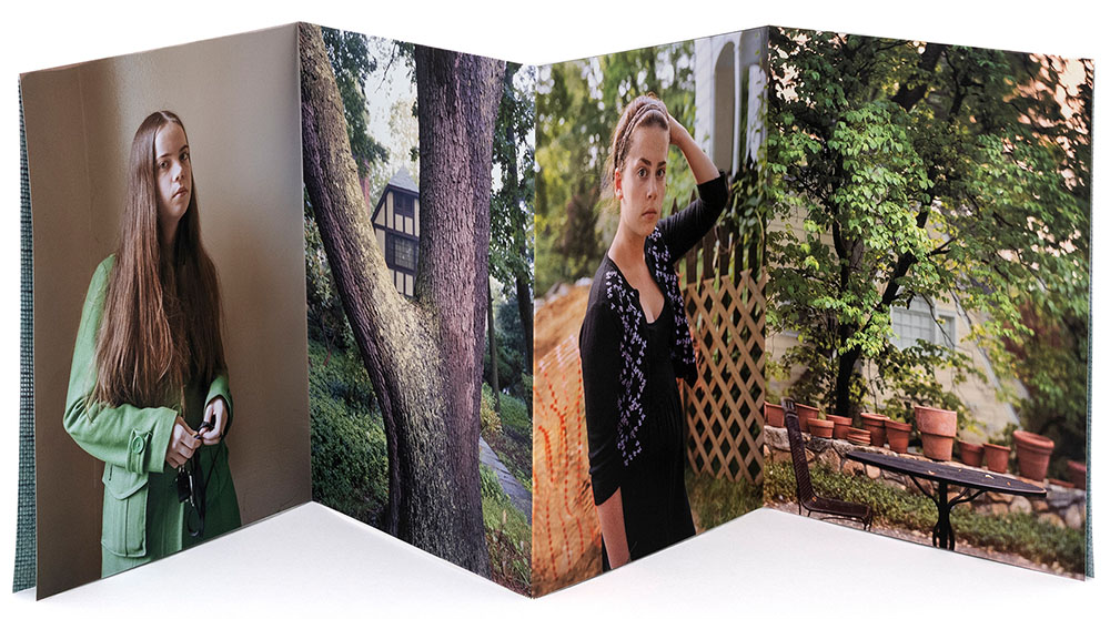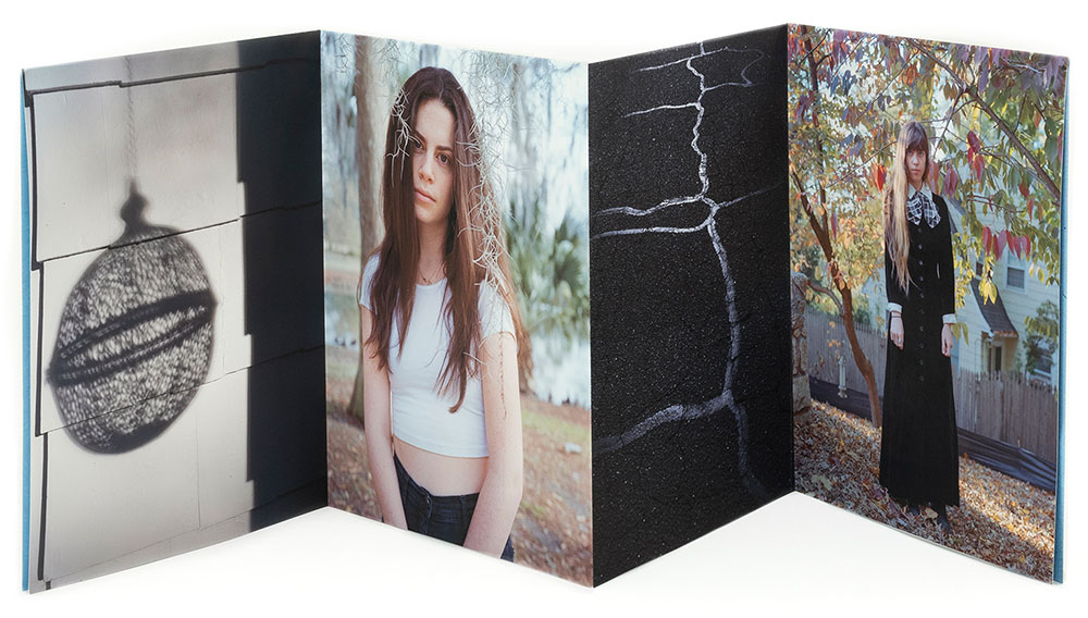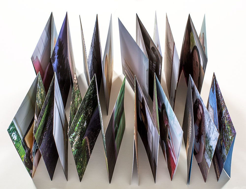 The book is organized into a dedication to Hawarden in conjunction with eight loose chapters, each as a stand alone leporello folded sheet, with ambiguous titles; Eight Day Clock, Shadow Catcher, Brick-A-Brac, Hook & Eye, Two Pair Back, Looking Glass, Permanent Autumn and Magic Lantern. The photographs are a mash-up of portraits with environmental elements and objects that provide context for the lives of Connolly and her daughters. I found the chapter titles to be interesting teasers as to what to search for that might inspire it. Some titles and photographs are perhaps easier to relate to and pair than others. It is that ambiguity in her sequencing and layout that draws me in.
