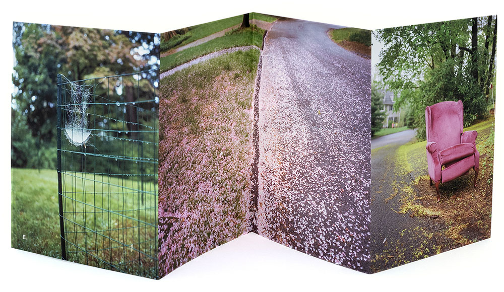 The layout of each of the eight chapters is essentially layered, as the folded leporello sheets have one set of images on one side, backed by another set of images, with yet another larger image is concealed within fold. In a recent presentation by David Chickey, the co-founder of Radius Book, he described this aspect of a book design as resulting in ‘something hidden, but exposed’. It is this wonderful layout design by her that continues to make this body of work very complex, thus intriguing.