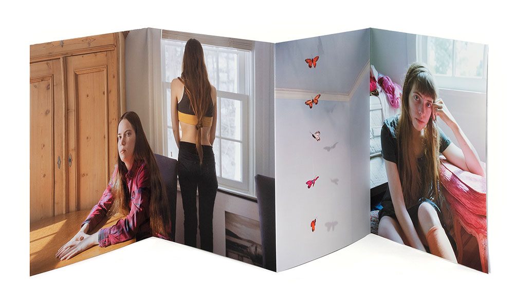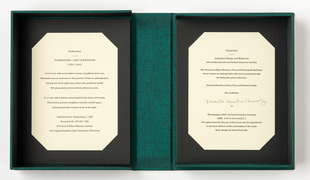 Lady Clementina Hawarden (1822 – 1865) was a 19th century British photographer who photographed her adolescent daughters, frequently incorporating the use of mirrors and other reflecting surfaces creating multi-faceted portraits and visual narratives exploring self-reflection and introspection. Interestingly little is known of her life, who remains a mystery and what is suspected is pieced together from her 800 photographic oeuvre, mostly of her children. That Hawarden focused primarily on three of her daughters was another parallel that inspired Pamela Landau Connolly’s photobook Fly in Amber, for which her own three adolescent daughters are her main subjects.