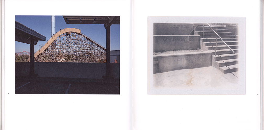 This photobook represents a great example of photographic documentation elevated to fine art. Two photographic techniques are blended in a beautiful design on large-format pages, and contrasting pairs of light and dark, as well as monochrome and color, allow us to see a world that is ready to supply solutions and greater certainty, so that the steps leading to nowhere might again be supplied with destinations, goals, and progress. Highly recommended.