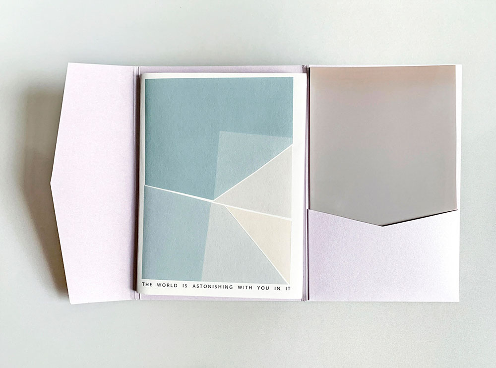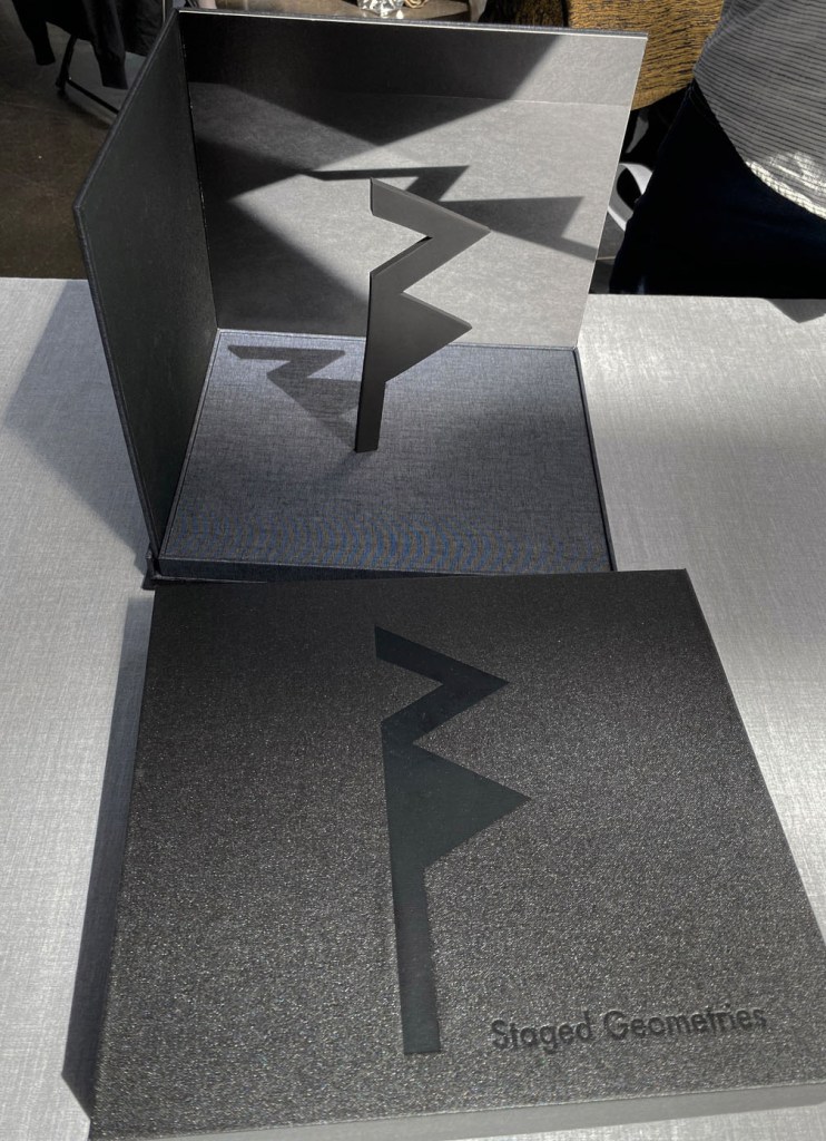 “Staged Geometries is a deconstructed artist book that allows the viewer to assemble its elements into an installation. This sculptural object uses the language of black and white analog photography to explore the interconnectedness of positive and negative and presence and absence. The installation varies depending on which photographic background is chosen by the viewer as well as any artificial or natural light that allows the ceramic to cast an additional shadow on the stage floor or wall.” — Paula McCartney