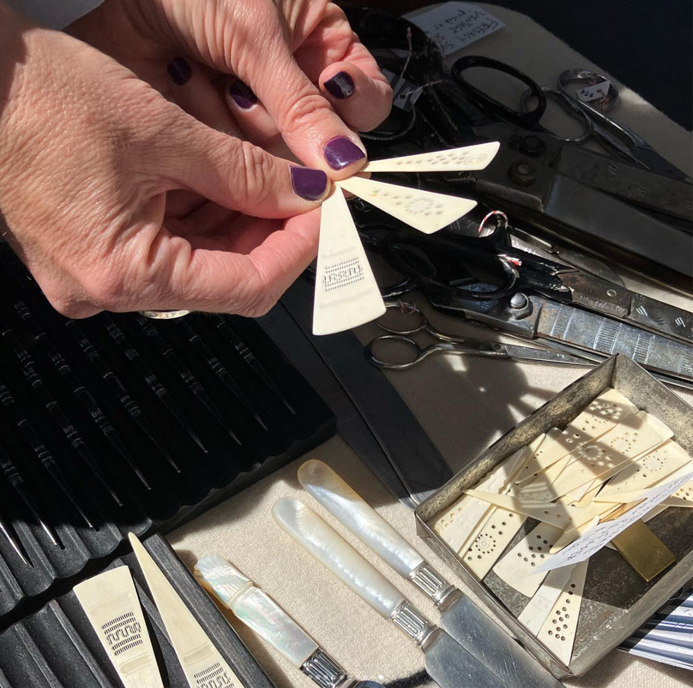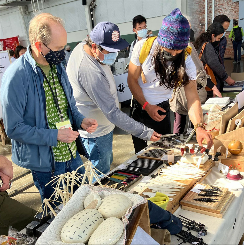 In addition to the vast array of artist books in the Pavilion floor there were vendors selling handmade paper, tools, and accessories for bookmakers. One such vendor was Shanna Leino who manufactures a small line of hand tools for bookbinders and craftspeople. What I loved about Shanna’s table was the re-purposed objects that she transformed into tools. There were mother-of-pearl butter knives for tearing paper, parts of Victorian fans made of bone for folding, and beautiful old scissors.
