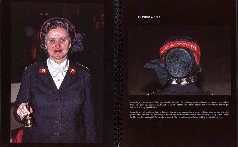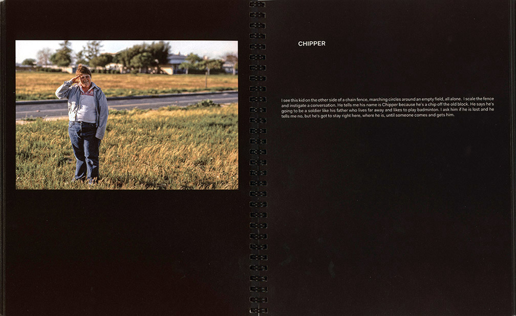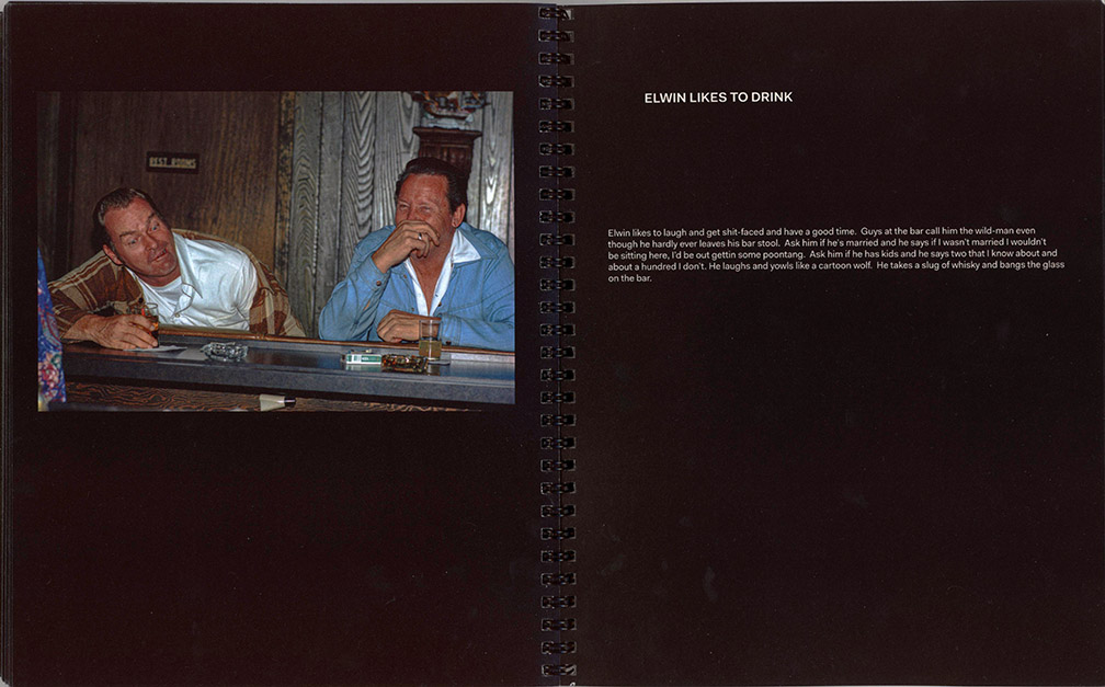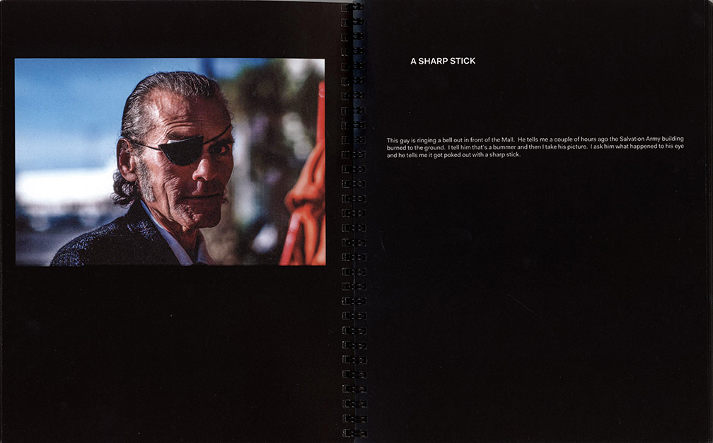 There are several distinct differences that make this work special. Sothern’s portraits are in glorious Kodachrome and printed on Cibachrome, two processes that are no longer available. In addition to Sothern’s keen eye and photographic acumen, this older technology adds to the refreshing immediacy of the portraits, even now that almost half a century has gone by. The slightly additional saturation gives the images a certain kick, a liveliness that benefits the capsules presented here. Sothern’s commentaries show his role as part of what he depicts, while at the same time there is also some distance in the critical remarks as verbalized in his humorous style. As always, the photographer projects himself into the work, both in the portraits (which are in my view always an extension of a photographer’s self) as well as in the image titles and the brief verbal narratives accompanying each portrait.