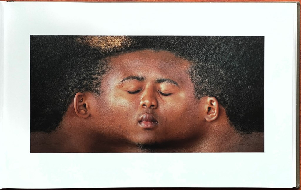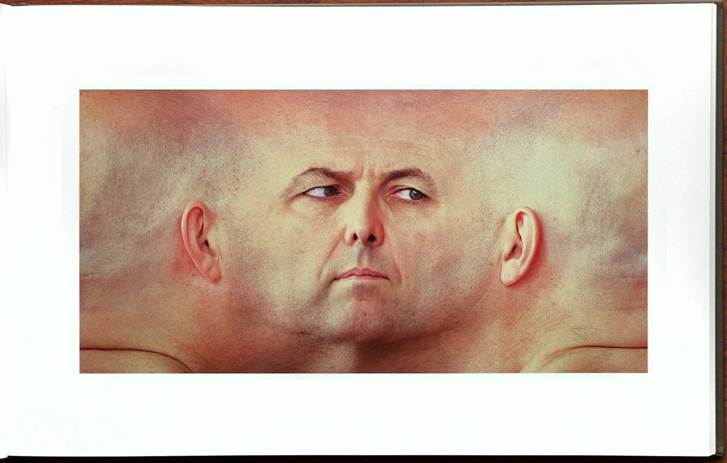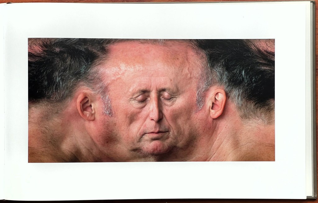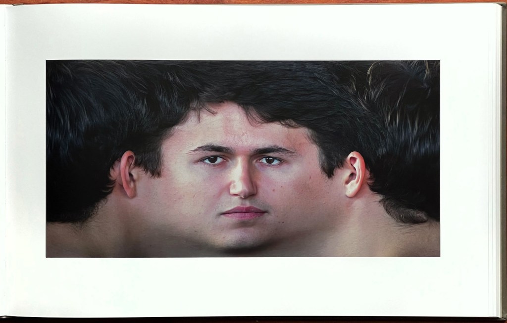 There is something other-worldly about these panoramic head depictions. We immediately notice that the center of the face takes up a much smaller amount of room of each entire head presentation than we had previously imagined, and that the hair, wherever present, is the ruler of the head volume. There is also something eerie about a slight emotional change we sometimes detect in the time during which the individuals are shown. Sometimes that is reflected in the titles the Koschies have given to particular portraits, such as references to doubt, suspicion, tension, and more. Religious and historical symbols and looks also come into one’s mind. Most of the people portrayed seem to sit fairly still during their thirty seconds or so, but some wiggle, perhaps giving rise to some interesting variations and/or ‘glitches’ occasionally, such as shown in the fifth page reproduction below.