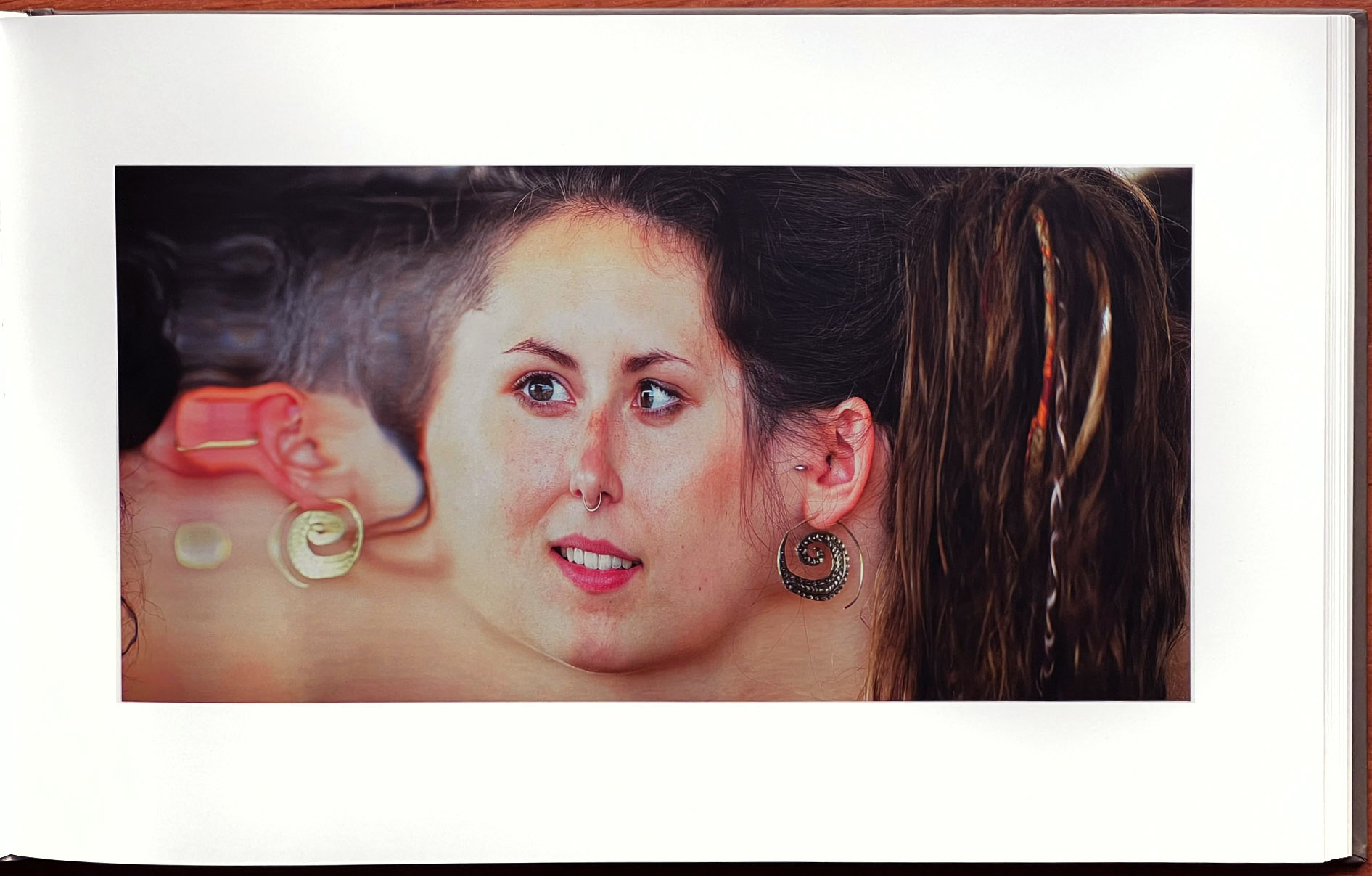 There is something other-worldly about these panoramic head depictions. We immediately notice that the center of the face takes up a much smaller amount of room of each entire head presentation than we had previously imagined, and that the hair, wherever present, is the ruler of the head volume. There is also something eerie about a slight emotional change we sometimes detect in the time during which the individuals are shown. Sometimes that is reflected in the titles the Koschies have given to particular portraits, such as references to doubt, suspicion, tension, and more. Religious and historical symbols and looks also come into one’s mind. Most of the people portrayed seem to sit fairly still during their thirty seconds or so, but some wiggle, perhaps giving rise to some interesting variations and/or ‘glitches’ occasionally, such as shown in the fifth page reproduction below.