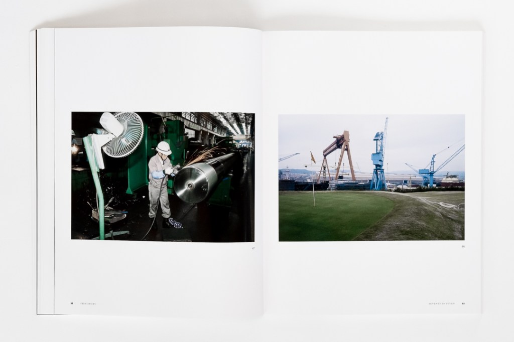 Another great example is the sequence of images 25-26. On these pages we see a “lottery,” which determines the equitable distribution of labor in Barcelona. This is contrasted with a man salvaging bricks from a demolished warehouse in Rotterdam. Again, the effort to attain frictionless accumulation is ever present. And another great juxtaposition occurs with images 47-48, wherein a worker finishes grinding the propeller shaft in a Hyundai shipyard engine shop while on the facing page we see a scene that could not be more different on first glance – a golf course lies in wait for visiting shipowners, which we discover, is in the same harbor. While neither party in the sequence would venture into the world of the other, Sekula takes us there photographically.