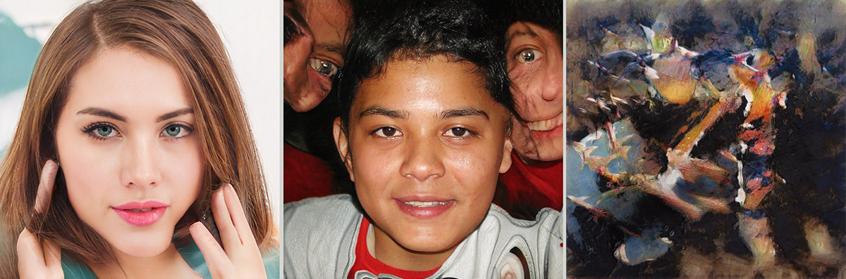 The ‘portraits’ look real, and yet we know that they show individuals that don’t exist. If we want to call these pictures photographs, that would call for a revision of our definition of that term. These are feature composites, not unlike the old morphing procedure, which created a fictional portrait that was an interpolation between two actual portraits. Here the process combines the facial characteristics from many existing portraits of existing individuals to make ‘unlikenesses,’ forming pictures of non-existing, fictional individuals under software algorithms. No reality, no copyright. As Reinhard Matz points out, such fictional characters have always been acceptable in painting, but are a novum in photography, which still has the old concept of documentary truth value attached to it. Maybe this can be one of the factors that contribute to the further elevation of photography as an art form. The challenge to us is the level of perfection that these generated images present to us.