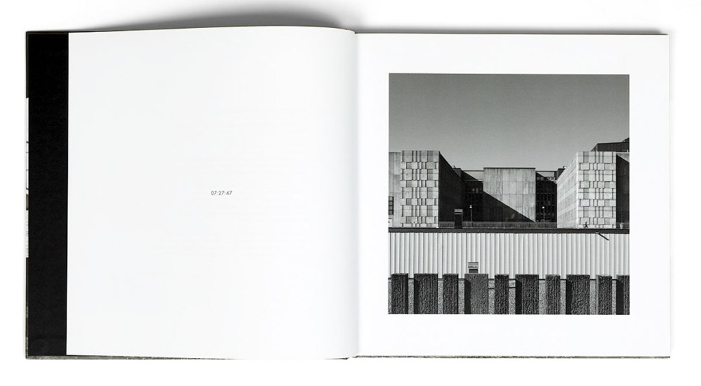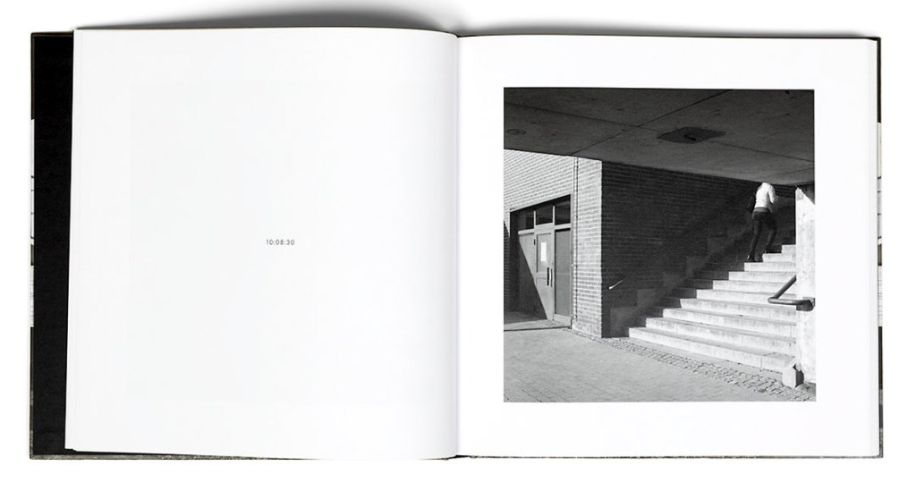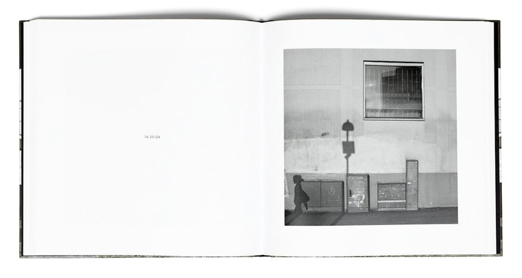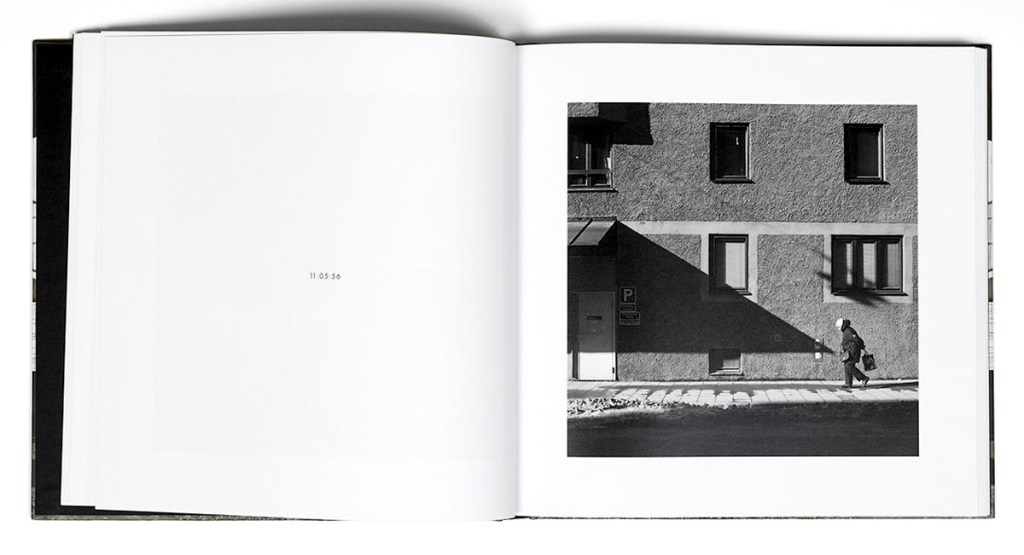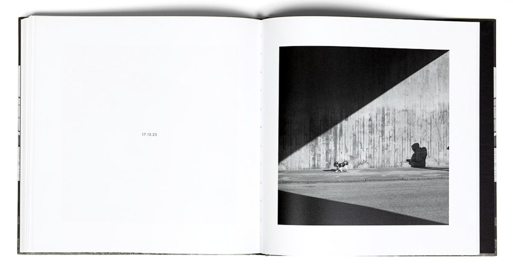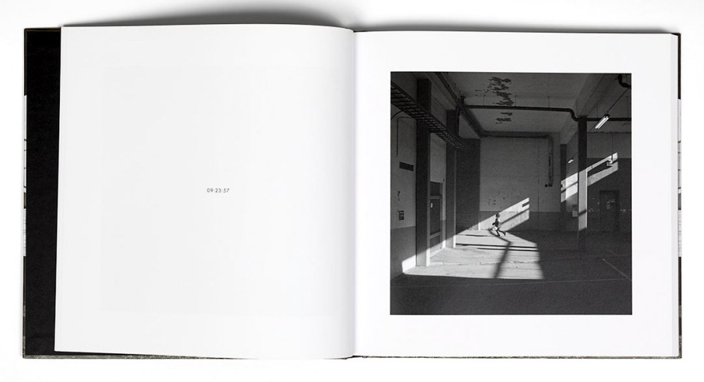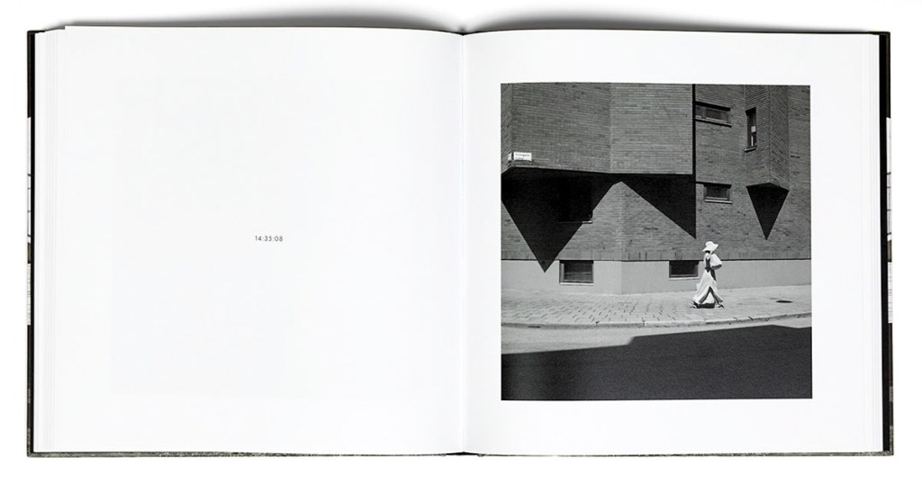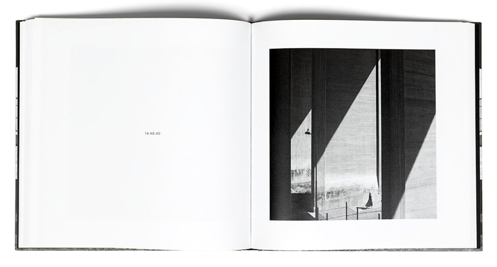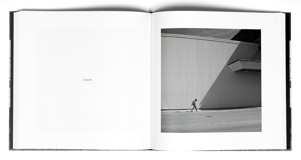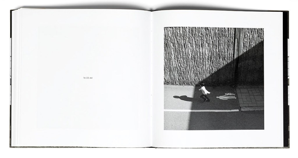 There are other moments in the book that delight. In one engaging example, a boy runs freely in an enclosed space with balloon in hand (“09:23:57”). In another, a woman in a flowing dress moves gracefully through a series of triangular shadows (“14:48:40”).
