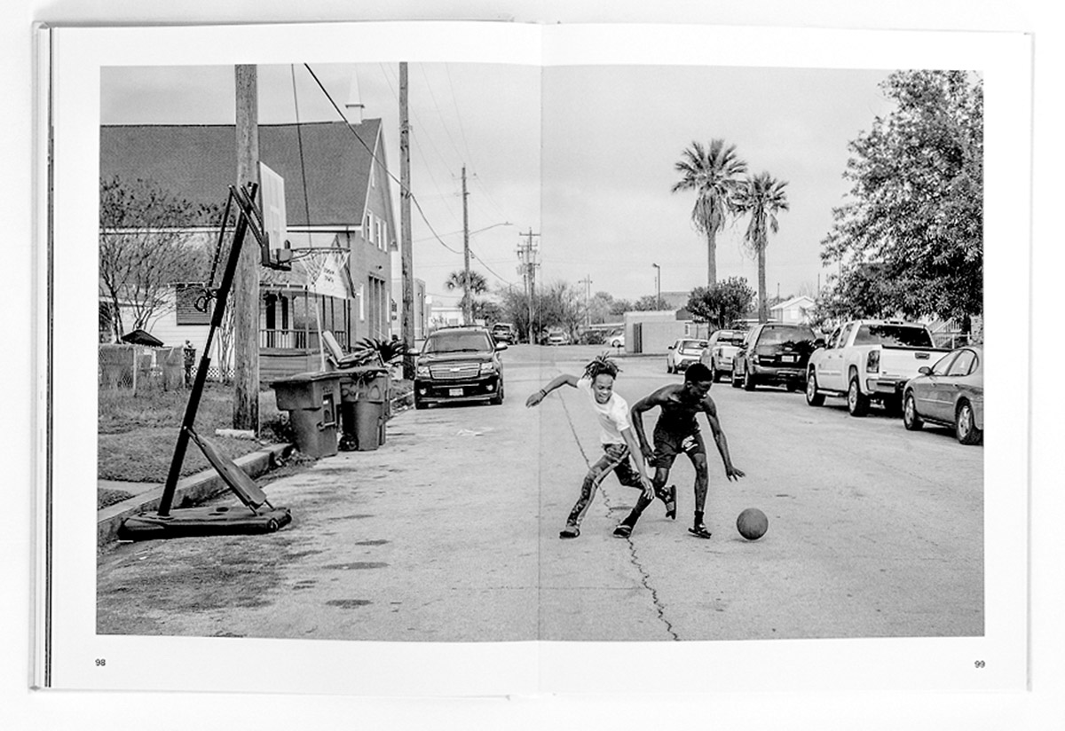 However, these are not typologies like those of Hilla and Bernd Becher and their students, i.e., of various types of infrastructure. Instead, Belleme was drawn to the more micro-cultural specificity of the places he was photographing. In one instance, a certain coastal disposition is on display with the veritable totems of dogs, angels, and family members cut out of downed trees within lawns, all of which have some relation to coping with the losses of Hurricane Ike. While these may not be “great” individual images in and of themselves, they are presented in a way that aids the comprehensive structure of the book and its narrative. These typologies are a smart contrast with much of the remaining imagery, where in other places, Belleme captures moments of play and joy on the streets, as well as worship, leisure, and urban decay.