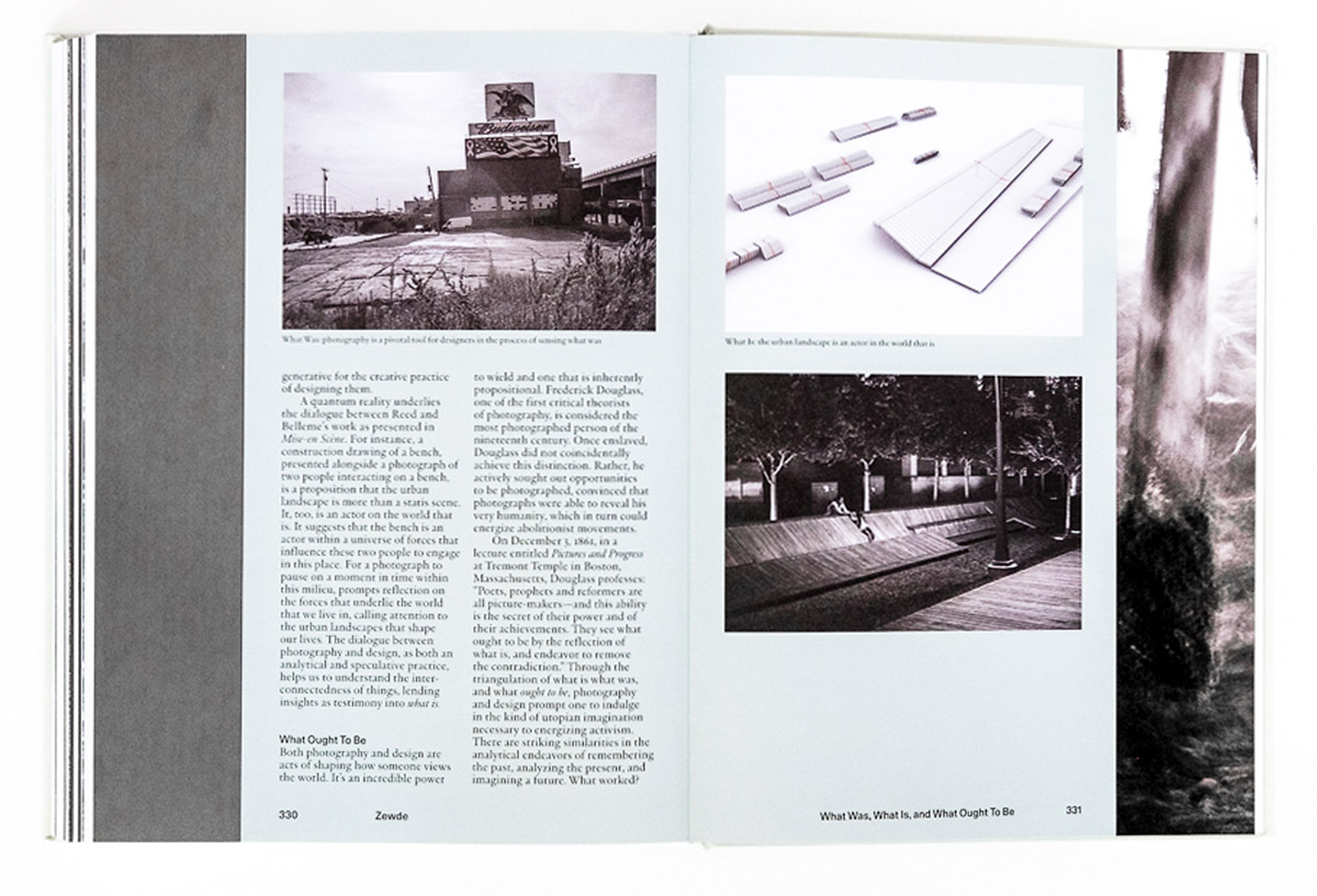 Mise-en-Scène is a handsomely designed book with tipped-in black and white images by Belleme on both the front and back covers cast within a green fabric cover and black stamped text. At 340 pages, including interior essays, which are very nicely laid in with alternate paper and size, by critic/curator Mimi Zeiger, artist-activist De Nichols, architecture scholar Julia Czerniak, ecologist/planner Nina Marie Lister and landscape designer Sara Zewede as well as statements by Reed and Belleme, the reader is treated to tremendous value for the money. Save for some color reproductions in Reed’s opening essay that mark out some inspiration and reference points, as well as various drafts of wireframe designs of the architecture featured within the book, the interior images of Belleme are presented in black and white with excellent attention to the tonality. It is a book that one keeps wanting to come back to, and is rewarded for doing so, as the wealth of material in the book register on both intellectual and aesthetic levels.