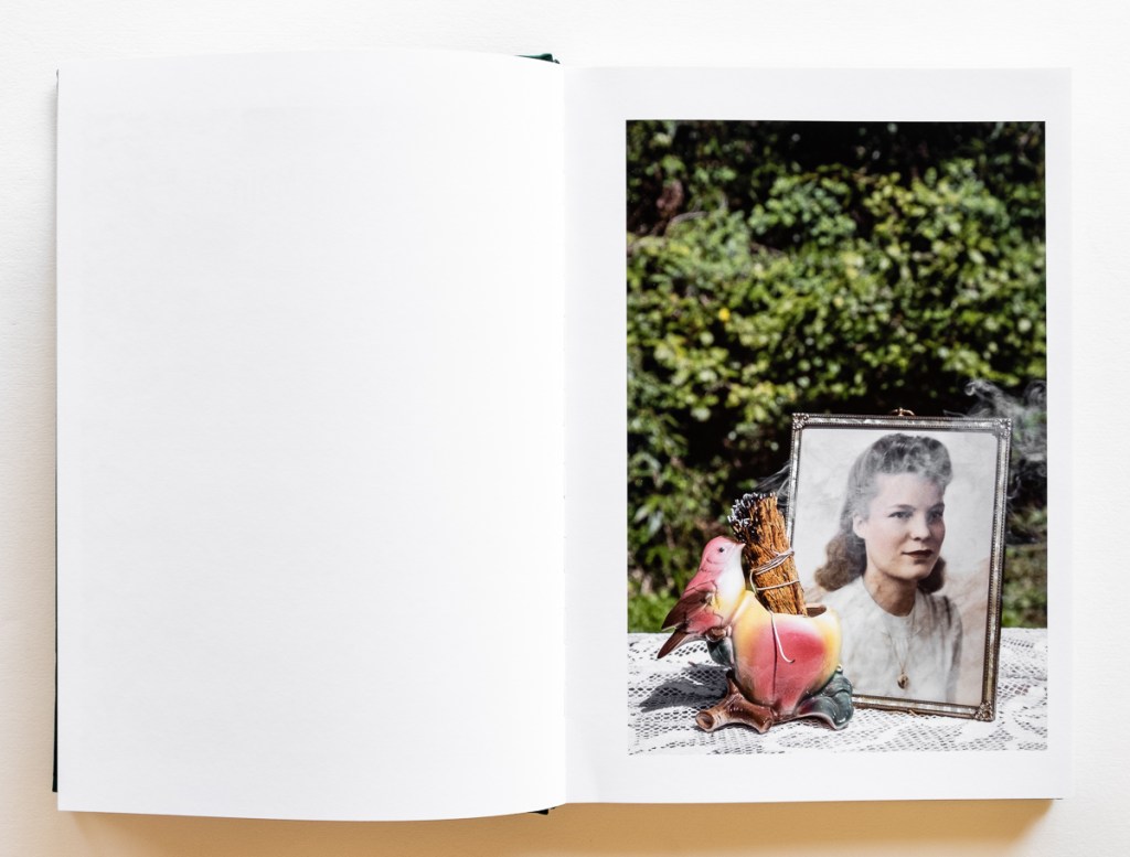 The book itself simulates a family keepsake. It features a suede cover like a family album, with the title in cursive letters like his grandmother’s handwriting. The inside cover has the classic boxes to fill in “This Book Belongs To:” and “If Found Please Return To:” The treatment of imagery and text evokes the random collection of memories pasted into a family album.