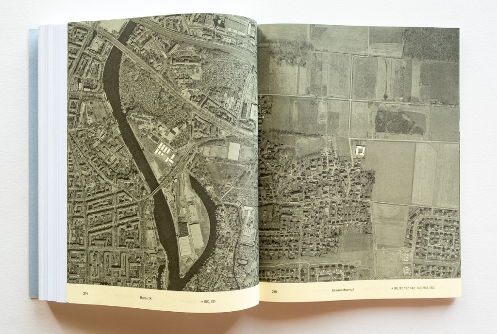 It’s all presented in a book that has earned awards for a clever design that mimics a governmental report. The cover makes it look like it would be at home on a bureaucrat’s desk. There’s even an elastic strap to help that bureaucrat open the book to any key document. Inside, the pages are color coded — yellow for front and end pages, white for photographs, green for government documents and architectural plans. The image pages include cross-references to aerial maps at the end of the book that show the location of each building complex.