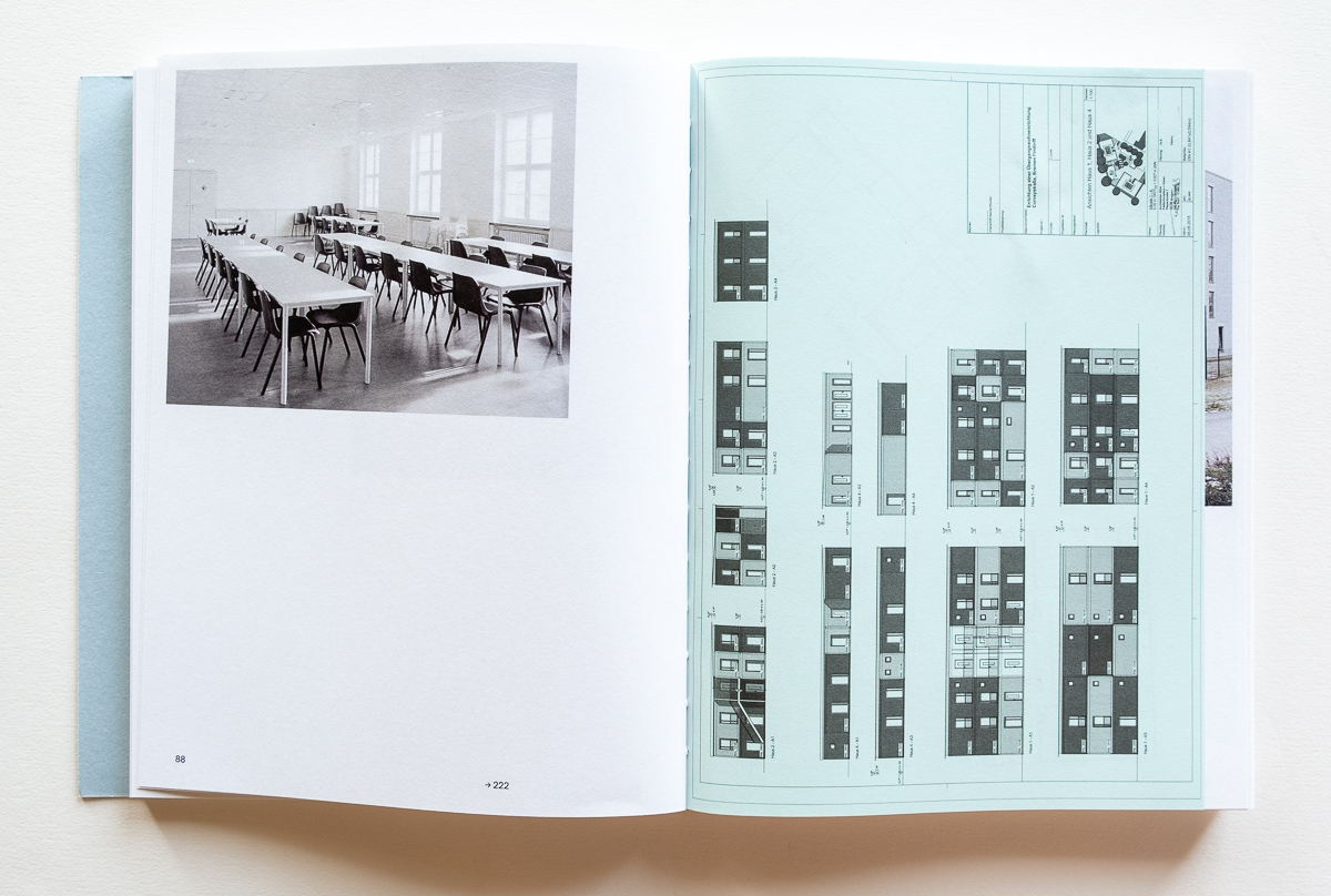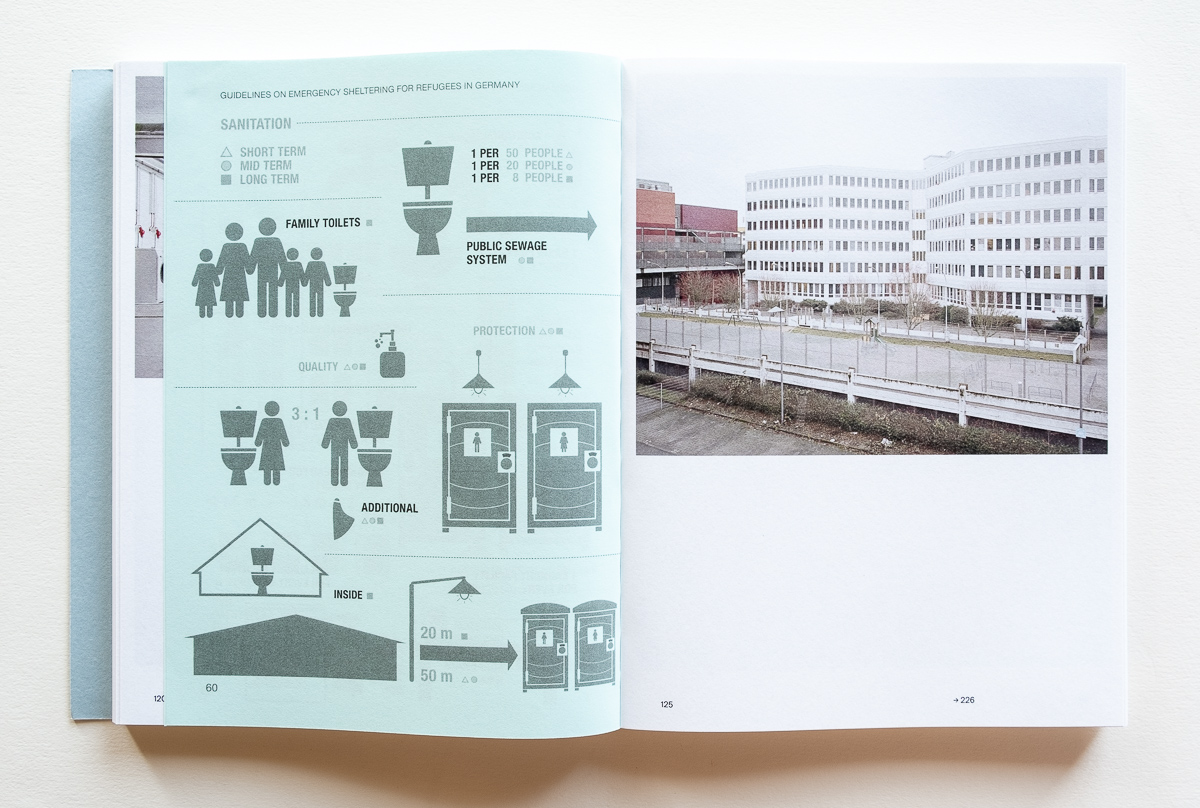 On the one hand, the architects and planners developed housing that is in many cases innovative and technically well-executed, providing a safe place for refugees to begin their journey toward assimilation in a new land. On the other hand, the buildings were purposely placed in greenfield areas on the edge of cities or in industrial areas, separated from existing communities. Additionally, sociologist Philipp Piechura writes in the book’s introductory essay that “refugees often have to spend years of their lives in these buildings. Thus, shelters, paradoxically, become both starting points and barriers on the way to a new life.”