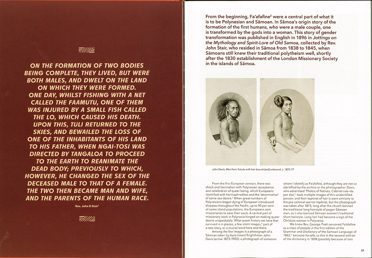 The book is a combination of images and essays that allow us to interpret a multitude of these issues through a historical magnifying glass and through public performances and exhibits in our time, including at the 59th Venice Biennale in 2022. We see Kihara performing the role of Salome on the stage (image 4). Fa’afafine poetry and interpretive essays help in providing us with an enlightening overview of these complex issues, not the least of which is the decolonization process. This book is very well designed, with many surprises and graphically appealing variations. Much expertise has gone into the production of this book – even the endpapers are based on a native pattern. To get a better understanding of all this, get the book, read the essays, and study the various visualizations. You will find that this combined project may allow you to extend traditional horizons with an expanded, more open attitude.
