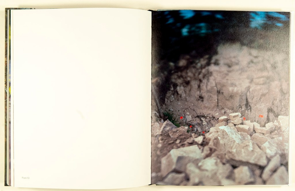 As mentioned above, the second half of Francisco’s essay is a selection from what he terms his para-book, which he describes as “notebooks, written by hand and containing research and reading notes, conversations and maps, also dreams and speculations.” These sections serve as expansions on or “explanations” of certain images or sites photographed. Though “explanation” is absolutely not the correct word. Para- in the sense used here, can be thought of as adjacent to, beyond or beside. For me, the most compelling passages from the para-book are those sections (8, 10, 11, 12, 16) wherein Francisco describes dreams, and the relation of the photographs (which are, after all, hard and factual proofs of real extant places) to his inevitably ambivalent goals and desires for this undertaking. As he writes of a dream in From the para-book/16: “and in that place my trial begins, i stand accused of a memory crime having to do with my camera, and a secret desire to make hell beautiful . . . “