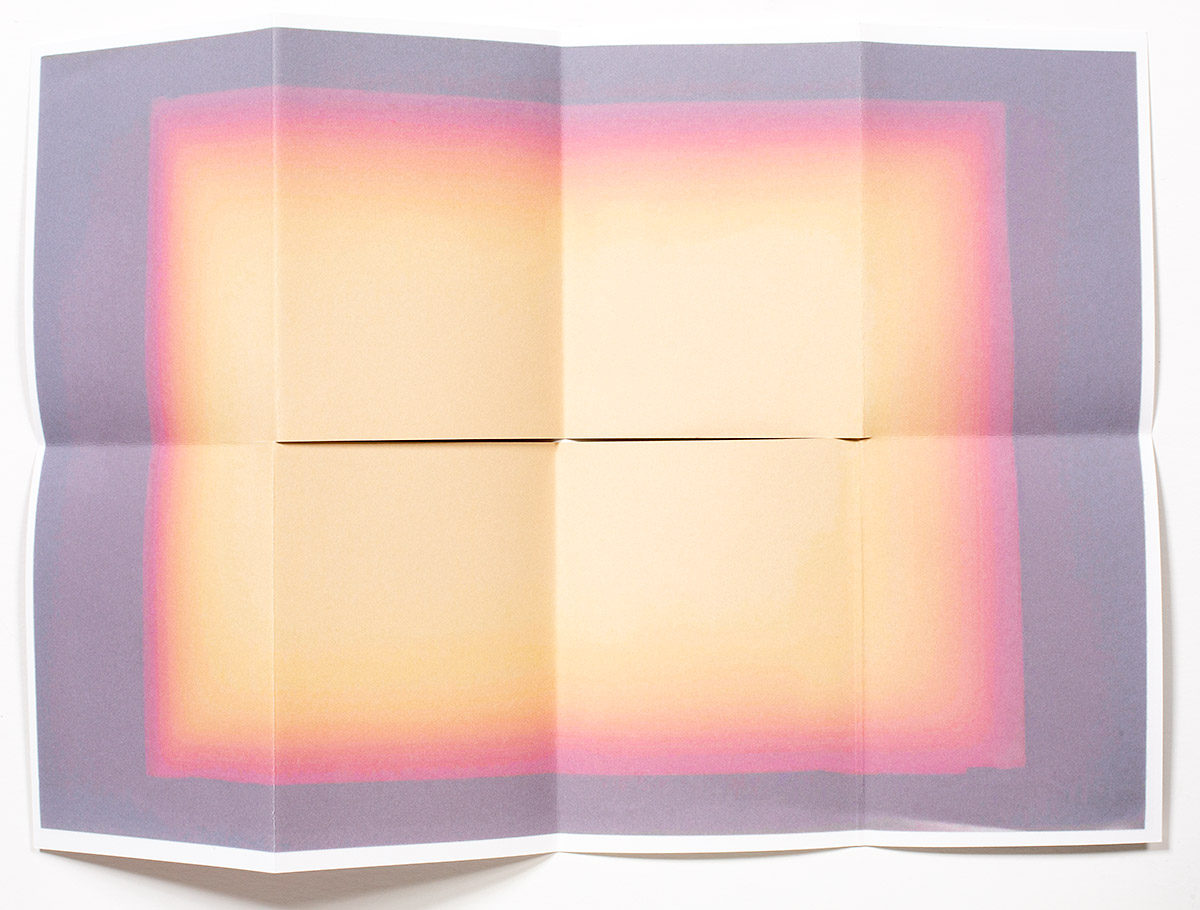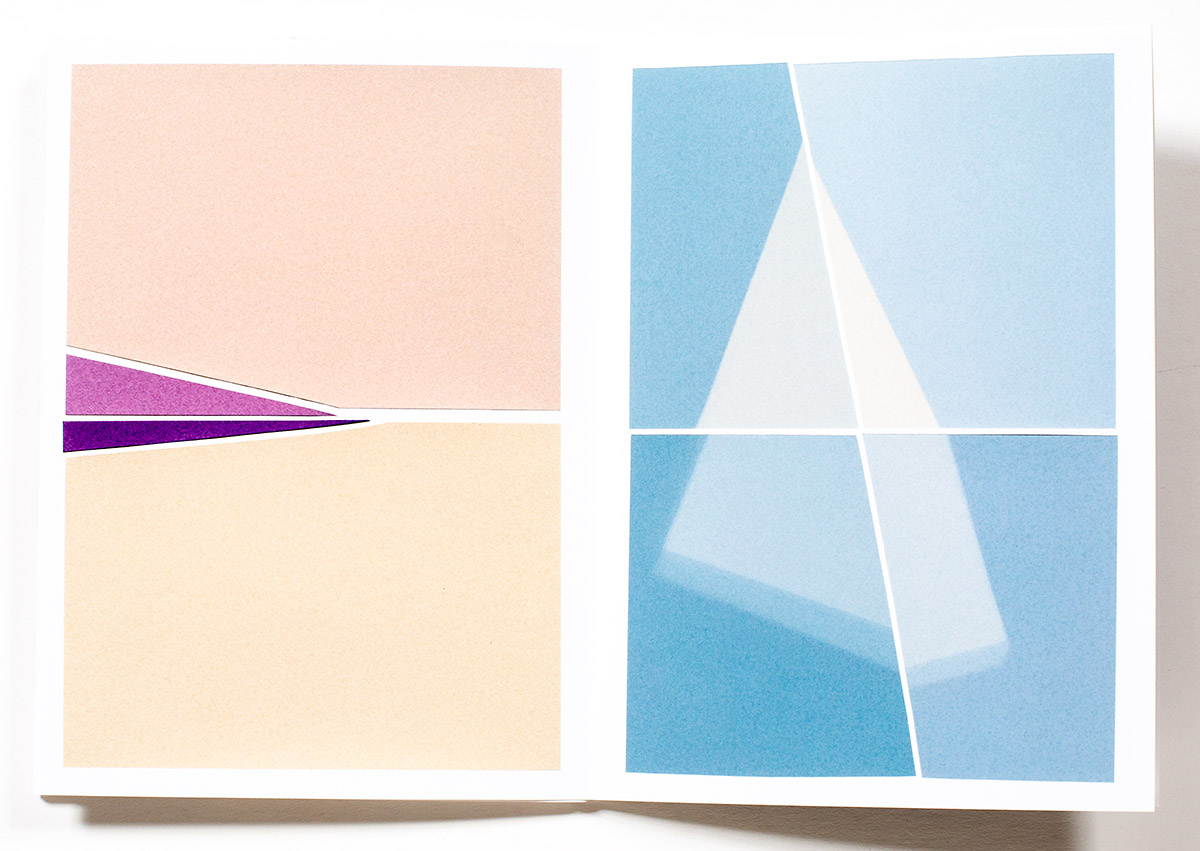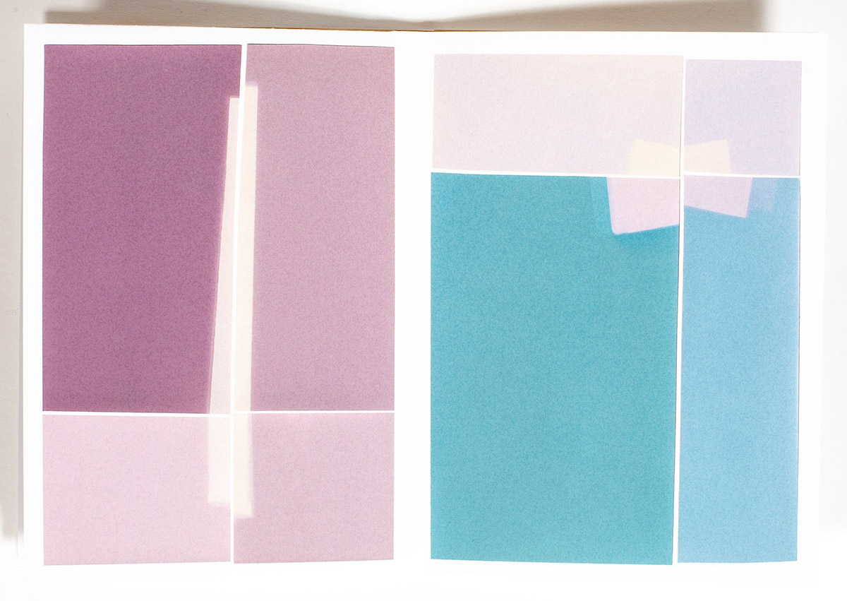 Her lumens and subsequent collages are angular, quasi-geometric shapes and patterns, with blocks of wash-out color that create sun-filled interior spaces. The potential hard edges of her lines have been slightly softened by her practice of using sunlight, as her starting object, three of her her mother’s books (field guide to bird/ferns/flowers), meant to block the sunlight also casts its shadow by the arc of the sun as it passes overhead. A series of conceptual objects based on nature, which are not intended to be literal interpretations, to mimick real life, but to use color and line through a process of reduction toward a simpler visual language. She deconstructs her initial lumen images to create collages constructing her final compositions, working each image with a pastel color palette to create a series of poetic images.