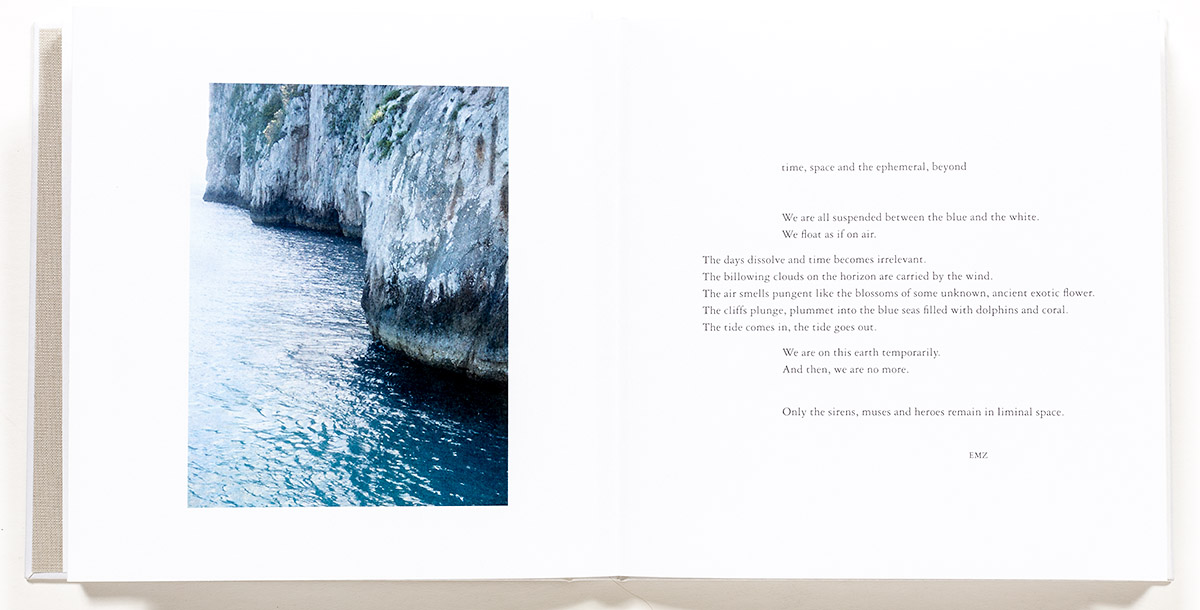 Zebrowski provides both poetic writing and images to investigate the spirit of Campbell. Her brief eulogy faces a photograph of an expansive Mediterranean Sea with a diminutive vessel in transit, a wonderful visual equivalence to Greek mythology that in death, one passes on a journey down the river Styx to the underworld. We could think of this small craft representing the ferryman of the dead, now in transit. Likewise, in mythology an individual has not had a permanent death, but continues to live on, which in this case occurs by means of Campbell’s written word that represents his afterlife.